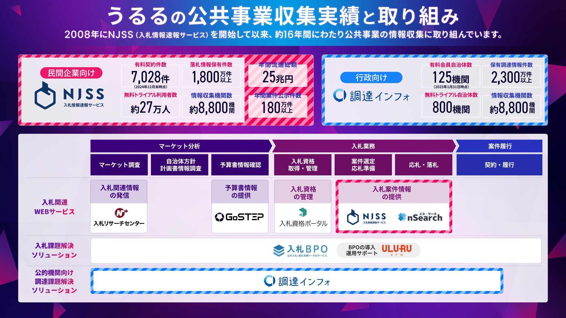 うるるはこれまで、企業へは入札情報速報サービス「NJSS」、官公庁に向けては調達購買サービス「調達インフォ」など、公共入札・調達業務の課題解決に貢献するGovTechサービスを提供してまいりました。 さらに、うるるの副社長であり、子会社である株式会社うるるBPOの代表取締役社長を務める桶山雄平は、徳島県小松島市のCIO補佐官として3期連続で自治体DXを支援し、デジタル化の推進に努めています。こうした取り組みを通じ、官と民双方に寄り添い、具体的な解決策を提供してきました。