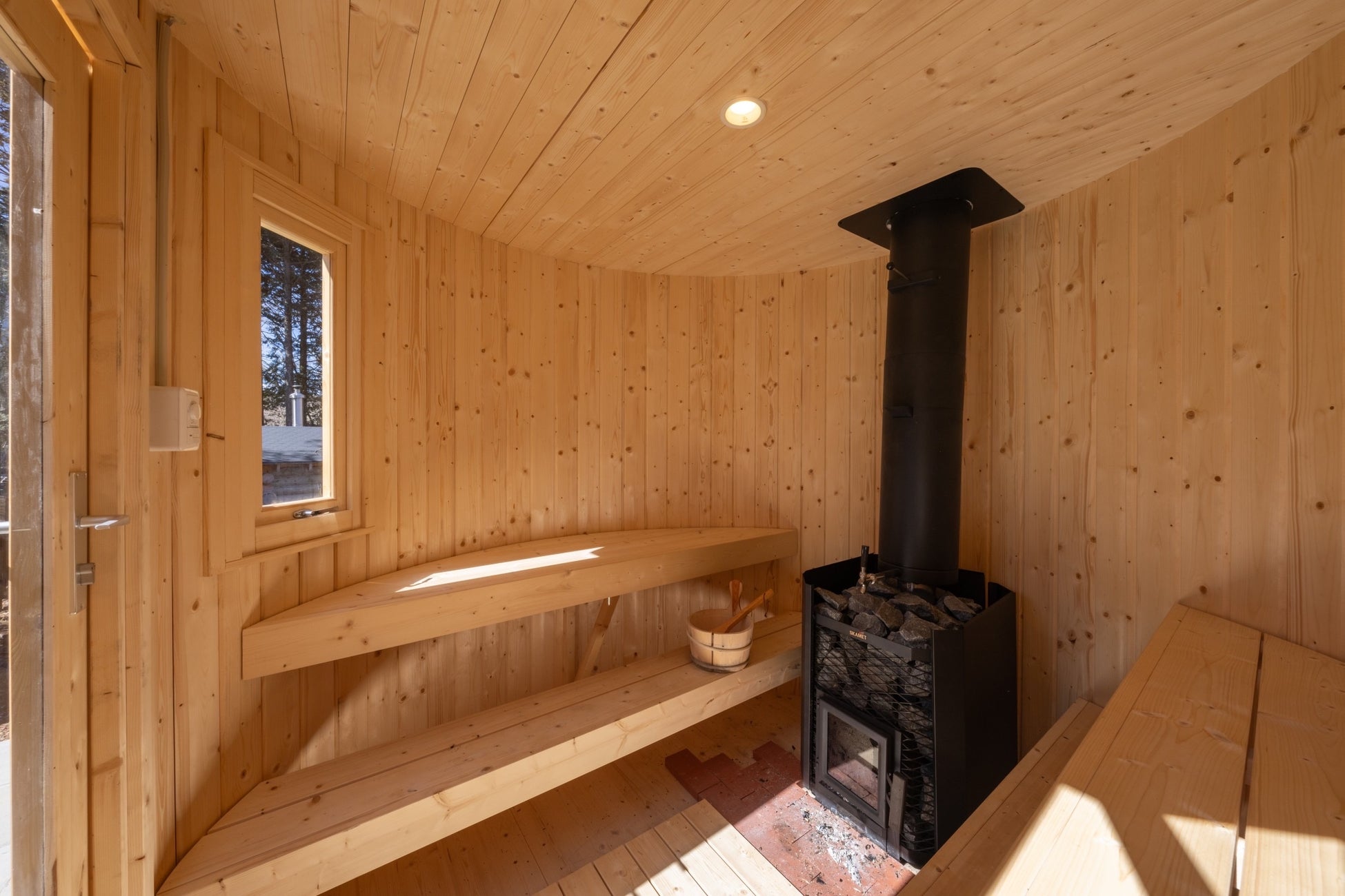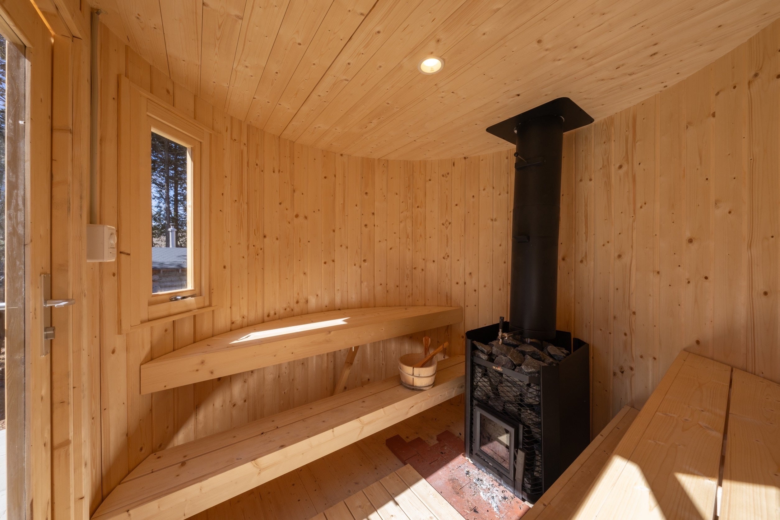 太陽光と雨水を活用し、電気、ガス、水道の消費を削減する環境に優しいサウナです。火の揺らぎを眺めながら、満点の星空の下で音楽を楽しむことができます。