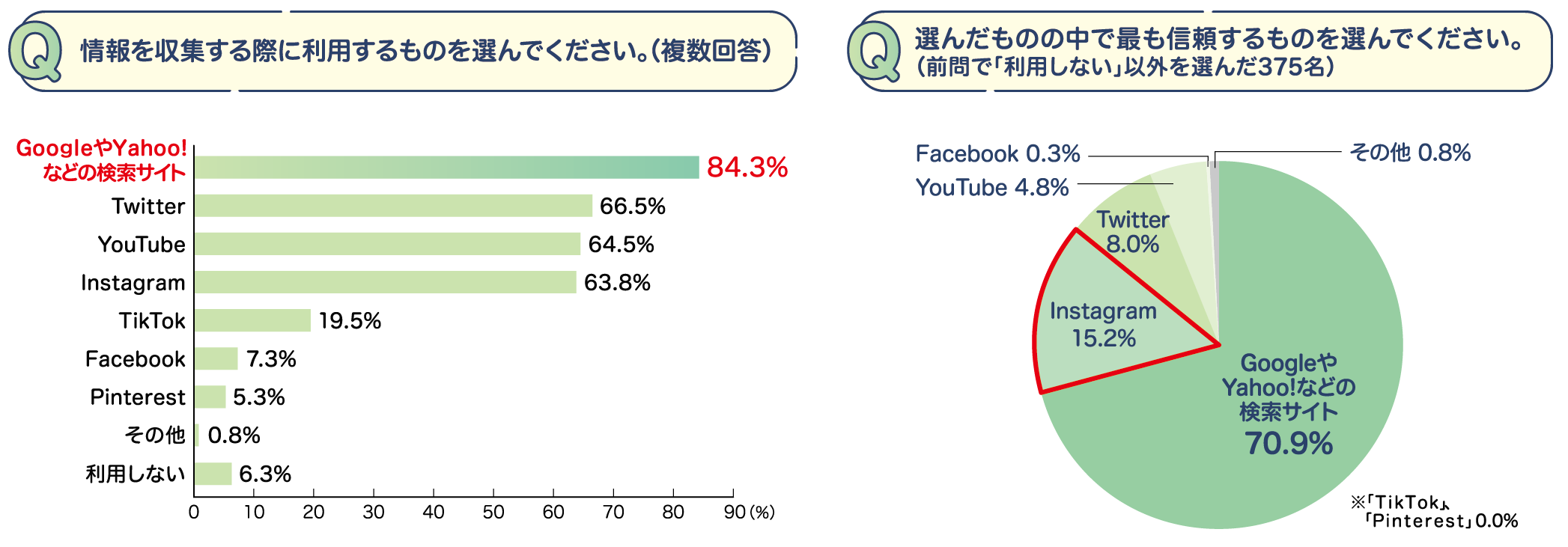情報を収集する際に利用するもの、その中で最も信頼するものは、いずれも「GoogleやYahoo!などの検索サイト」が1位となりました。一方で、最も信頼するものとして、「Instagram」と回答したのは15.2%で、SNSの中では最も多い結果となりました。
