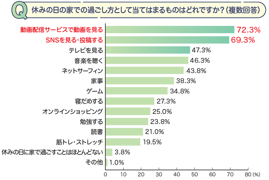 休日の家での過ごし方については、「動画配信サービスで動画を見る」「SNSを見る・投稿する」が上位となり、インターネットを活用した過ごし方をしている人が多いようです。