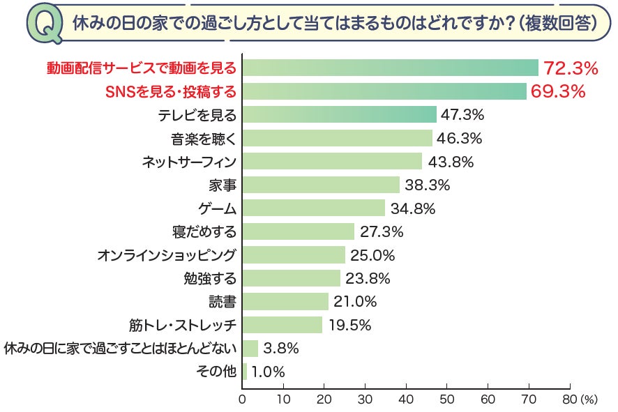 ・休みの日の家での過ごし方は「動画を見る」「SNSを見る・投稿する」が約7割