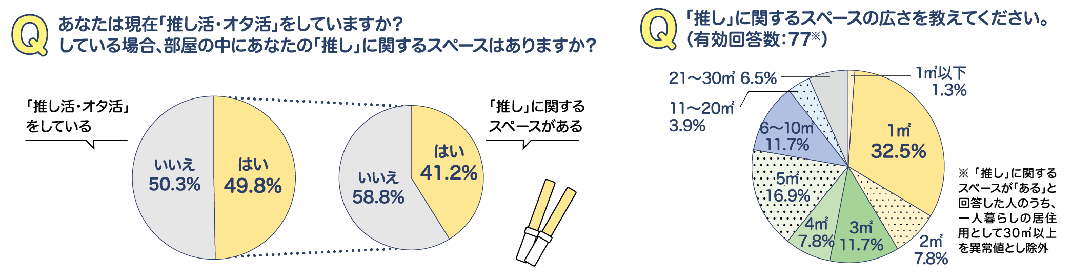 一人暮らしのZ世代のうち、約半数が「推し活・オタ活」をしていると回答しました。また、そのうち、約4割が部屋の中に「推し」に関するスペースをもっていることが分かりました。「推し」に関するスペースを聞くと、半数近くが4㎡以上と回答しました。
