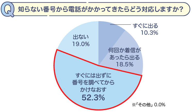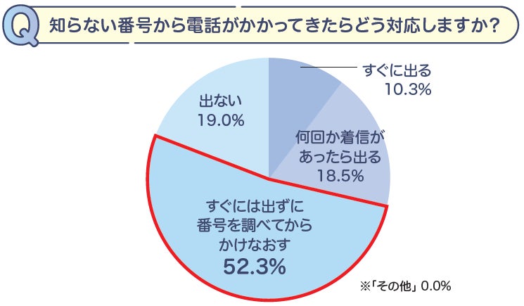 知らない番号から電話がかかってきた場合、「すぐに出る」と答えた人はわずか1割で、半数以上は「すぐには出ずに番号を調べてからかけなおす」と回答しました。