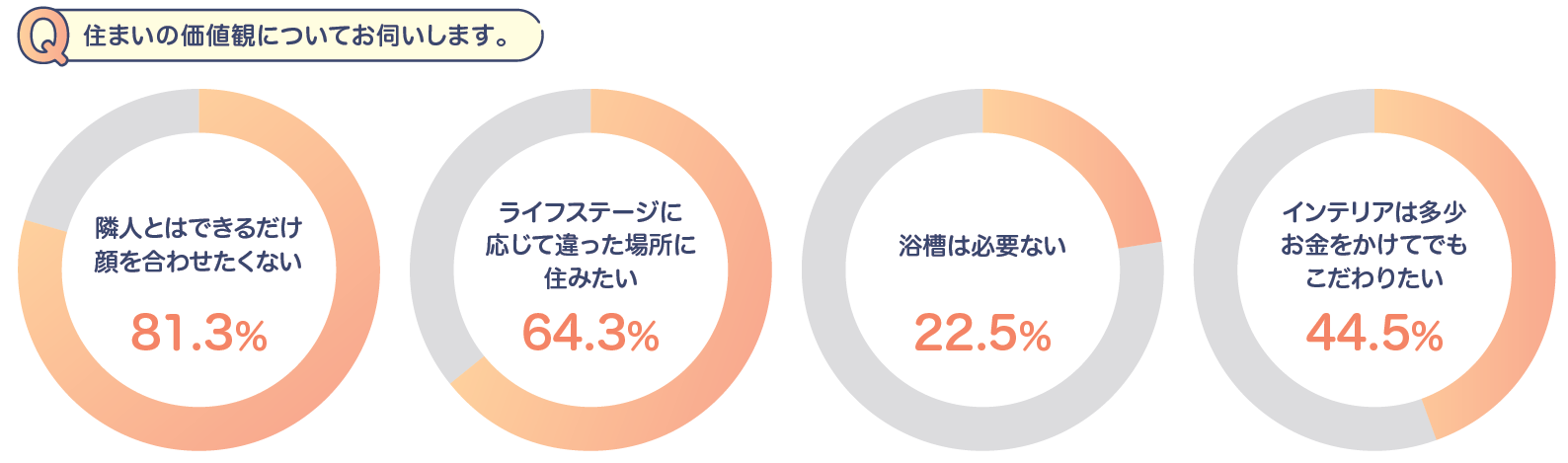 住まいの価値観については6割以上が「ライフステージに応じて違った場所に住みたい」と回答し、転職・結婚などに合わせて住まいを変えたいという意向がみられました。また、2割以上が「浴槽は必要ない」と回答し、シャワーだけで済ませる人も一定数いることが分かりました。