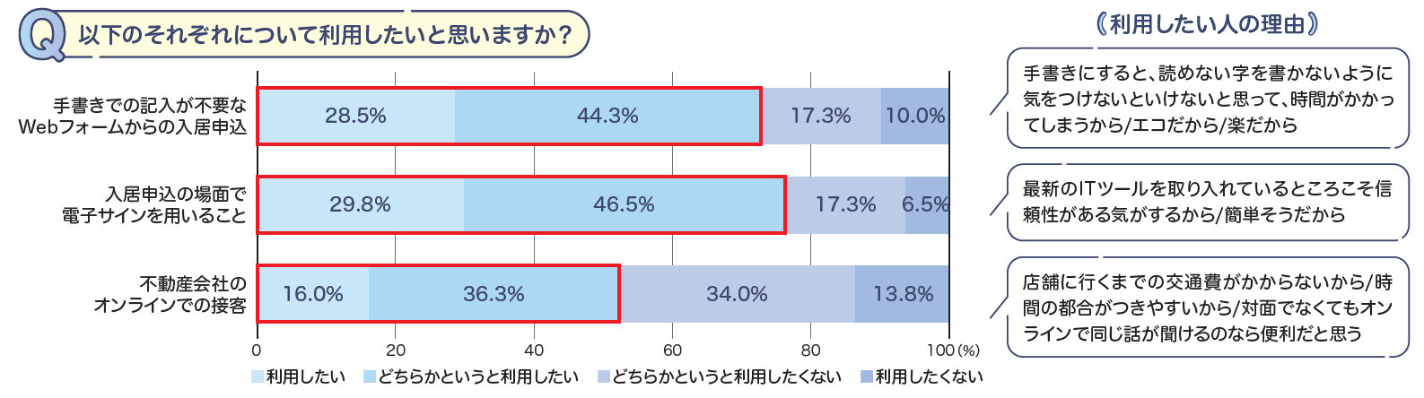 「Webフォームからの入居申込」や「電子サイン」については、いずれも7割以上が「利用したい」「どちらかと言うと利用したい」と回答しました。理由としては「便利そうだから」「最新のITツール取り入れているところこそ信頼性がある気がするから」といったコメントが目立ちました。