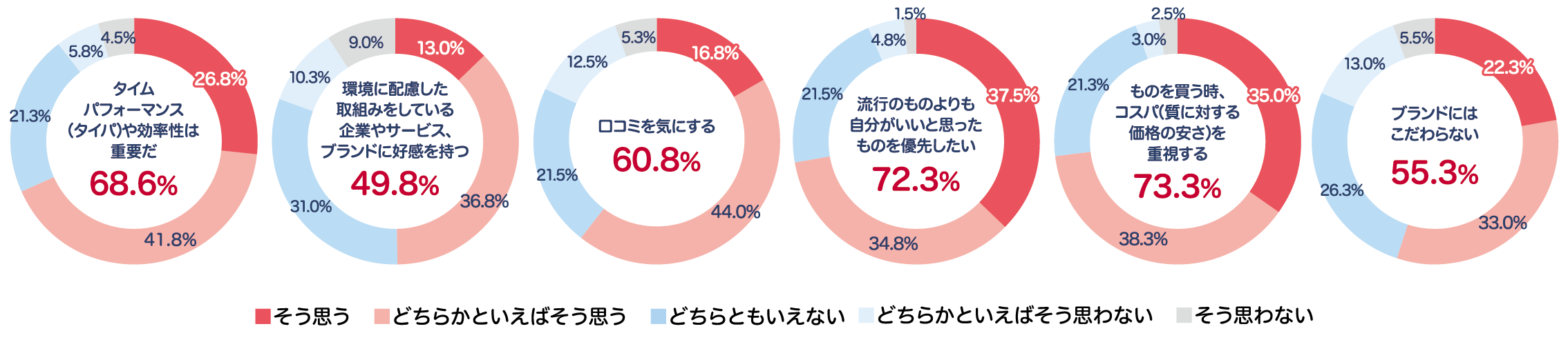 各項目の考え方について5段階で聞いたところ、「タイムパフォーマンス(タイパ)や効率性は重要だ」、「流行のものよりも自分がいいと思ったものを優先したい」、「ものを買う時、コスパ(質に対する価格の安さ)を重視する」について、約7割が「そう思う」「どちらかといえばそう思う」と回答し、時間やお金などのコストに対するシビアな考え方が表れました。
