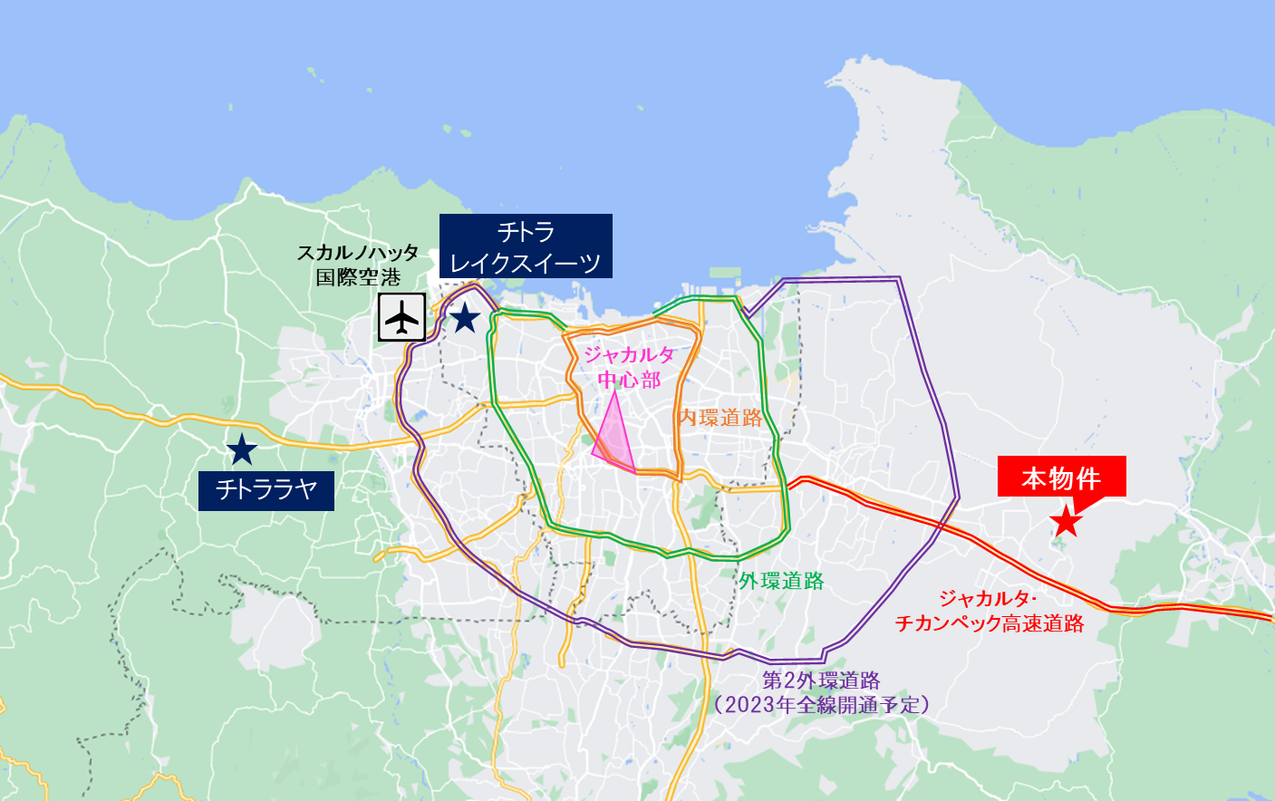交通 : ジャカルタCBD(中心部)まで約35km(車で約1時間)