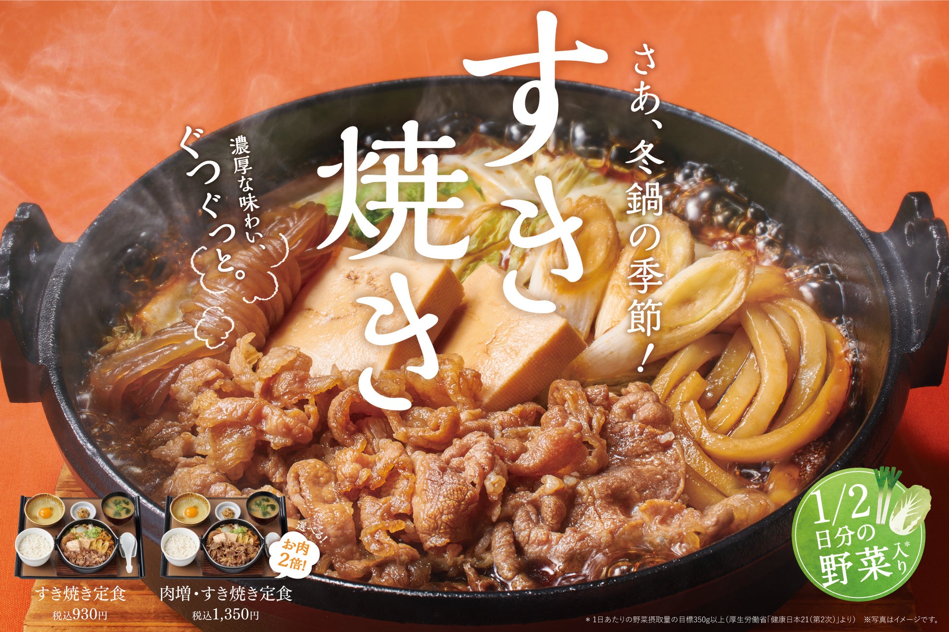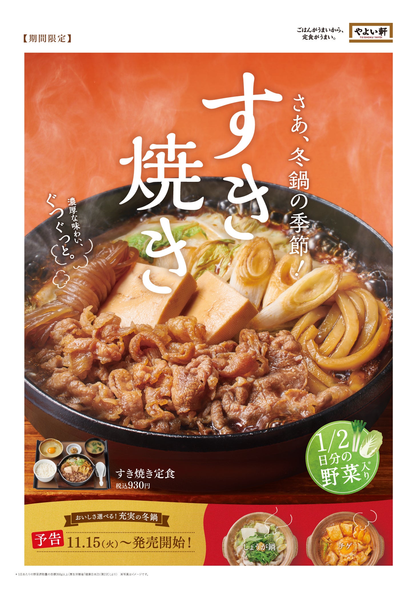 「やよい軒」今年も冬がやってきた! 冷えた身体に“グッと”染みる、人気No.1鍋定食 すき焼き定食 930円 11月2日(水)新発売