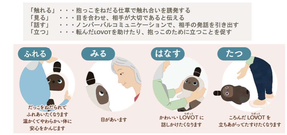 また、現在注目されているケア技法「ユマニチュード®」(※『ユマニチュード』:フランス語で「人間らしさ」を意味する認知症のケア技法)で重要視されている「触れる」「見る」「話す」「立つ」の4つに近しい動きを、『LOVOT』が認知症の方に促すことができると考えており、GROOVE X では、認知症の方が自分らしく生活するために貢献できることはないかを模索しています。
