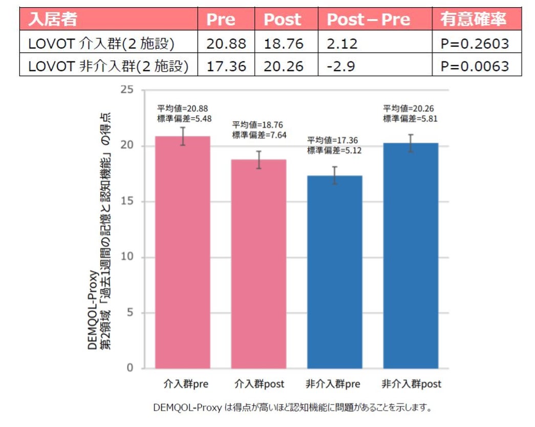 神戸市が実施する「CO+CREATION KOBE Project(民間提案型事業促進制度)による支援のもと、2021年に介護施設内で行われた実証実験では、『LOVOT』と接触のあった入居者(介入群)は、事前事後で比較した際に、認知機能の統計的有意に変化が見られず、認知機能の低下が抑制された可能性を確認しました。介入群(LOVOTと触れ合った層)と非介入群を比較した場合に、有意に差があります。入居者の方の認知機能の低下抑制効果を期待できる結果が示されました。