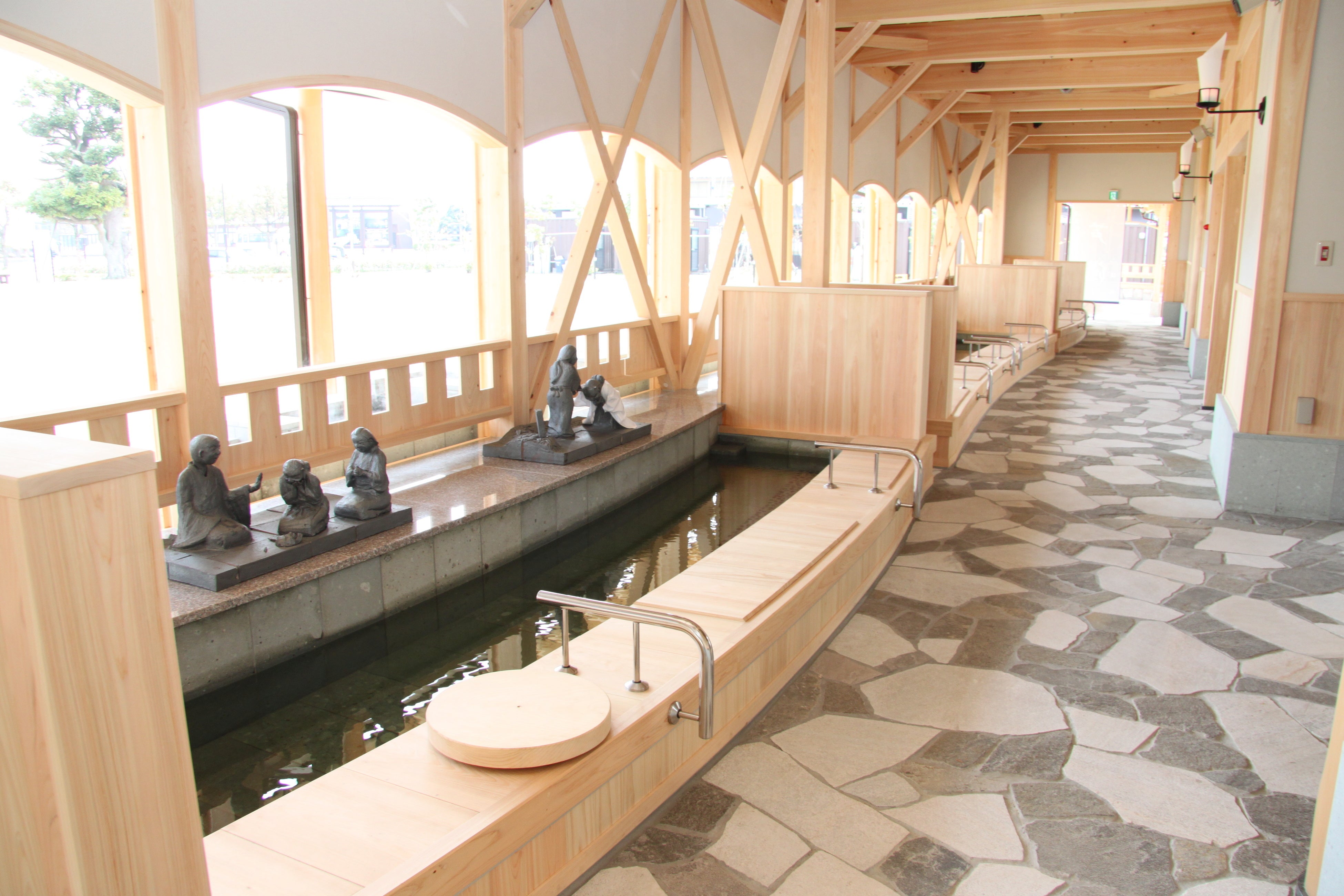 笏谷石(しゃくだにいし)をふんだんに使用した、総ひのき造りの上質な足湯。2種類の泉質の異なる源泉を使用し、源泉かけ流しで、5つの浴槽で楽しむことができます。