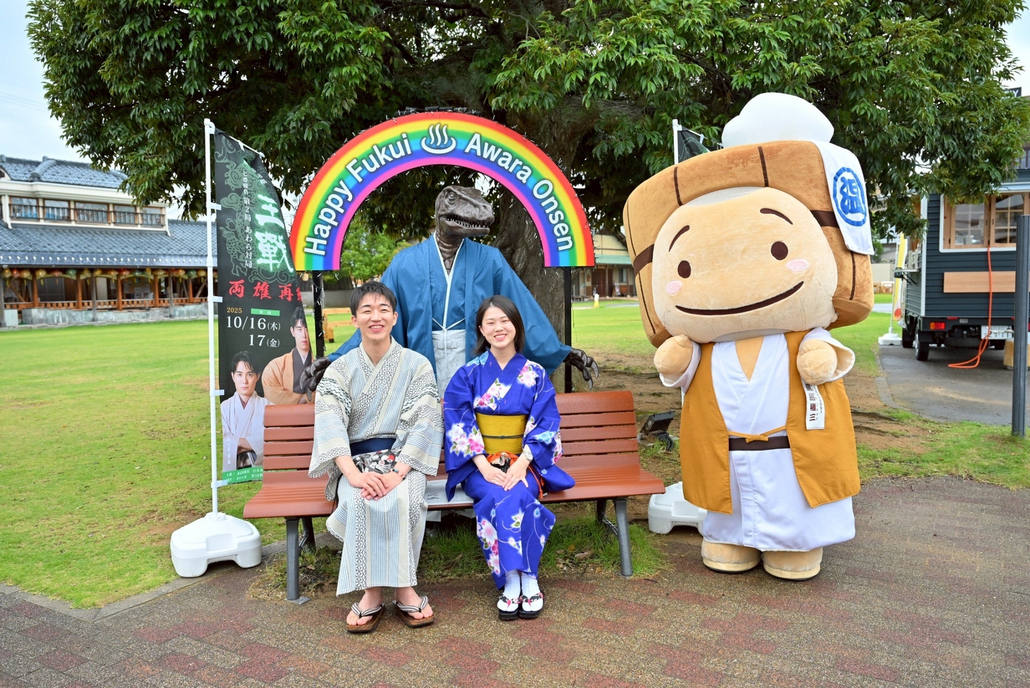 色浴衣に身を包んだお二人が訪れたのは、あわら温泉湯のまち広場にある無料の足湯「芦湯」です。