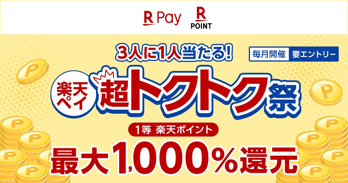 「楽天ペイ」アプリの利用で最大1,000%還元!「3人に1人当たる!楽天ペイ超トクトク祭」を開催