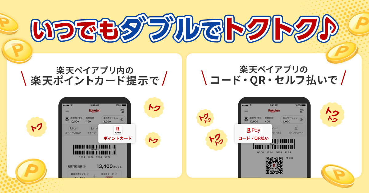 「楽天ペイ」アプリひとつで「楽天ポイントカード」提示と「楽天ペイ」アプリの決済の両方を行うことができ、ダブルで「楽天ポイント」が貯まります。