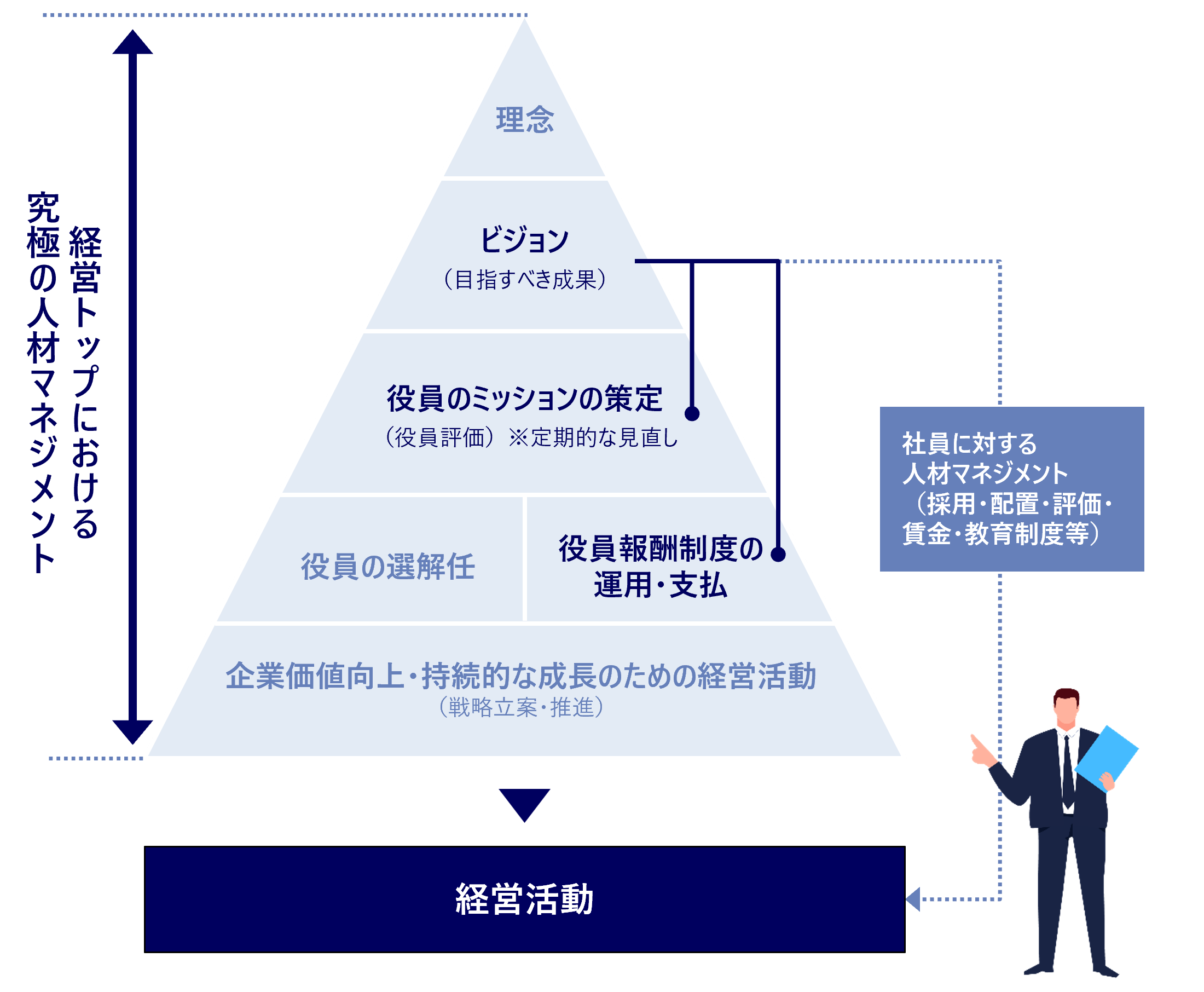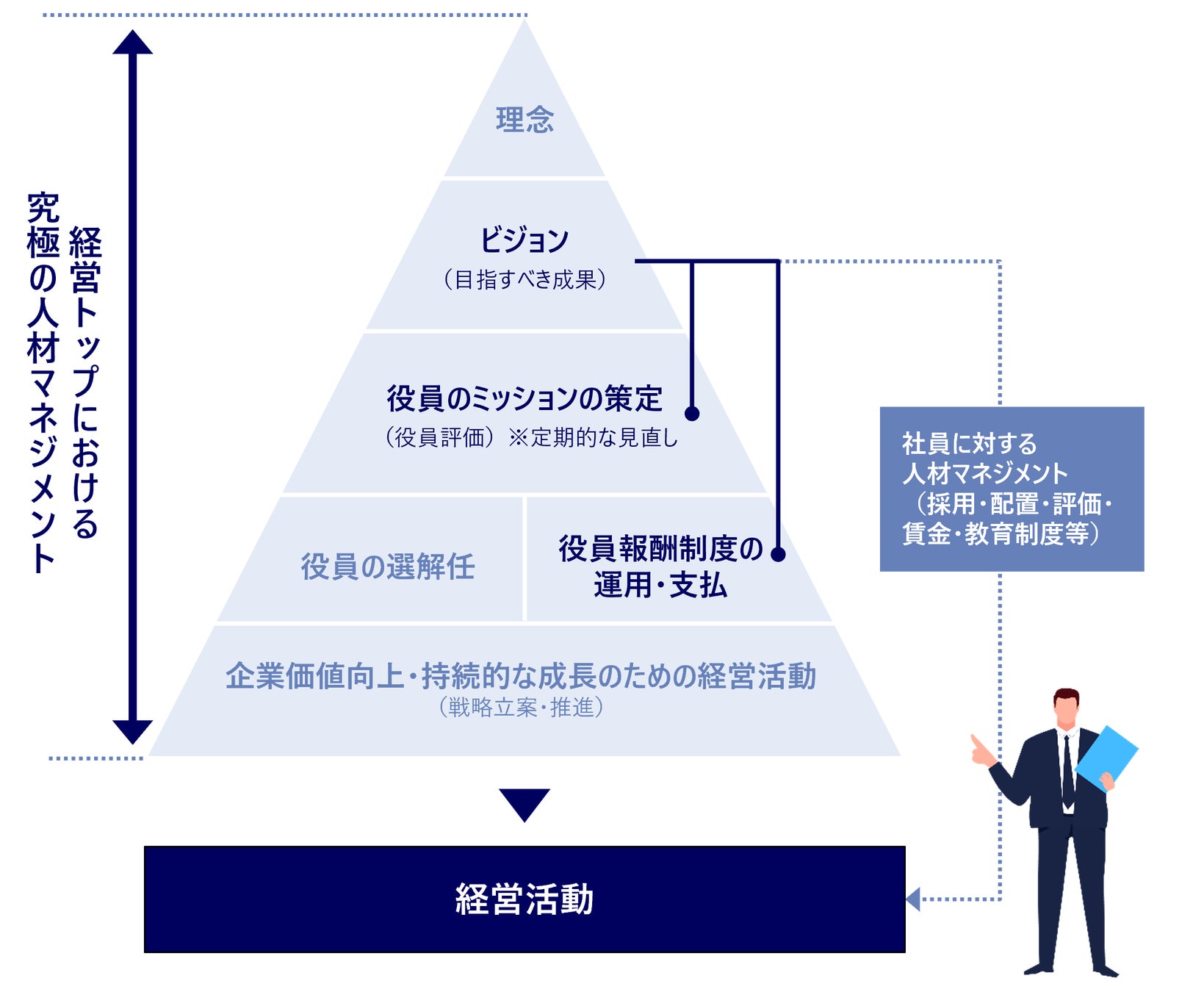 いかなる戦略も「誰に任せるか、どのように報いるか」が重要です。役員報酬は、短期・中長期的な業績と成果に対する「報酬」であると同時に、経営トップが自らの評価を決定するトップマネジメントです。具体的には、業績と連動した報酬とすることで、役員は業績向上の取り組みに注力し、企業価値を高めることで、自身の報酬を増やすことが可能になります。中長期的なビジョンの達成を目指すためにも、それらを反映した報酬設計が必要です。そして、役員報酬には短期・中長期的な目標を達成しようとする意欲を鼓舞する役割があるのと同時に、報酬額やその決定プロセスには透明性・客観性が求められます。