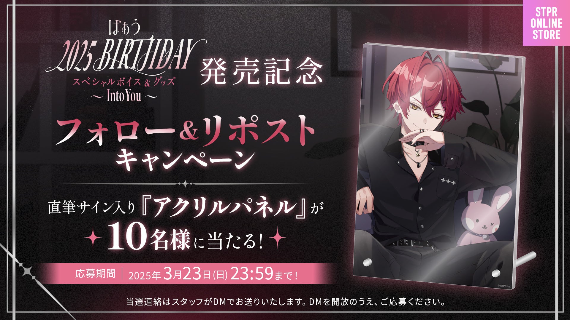 「ばぁう」のバースデー記念オリジナルグッズの発売を記念して、フォロー&リポストキャンペーンを実施いたします!ばぁう公式Xをフォロー&該当ポストをリポストした方の中から抽選で10名様に【直筆サイン入りアクリルパネル】をプレゼントいたします!