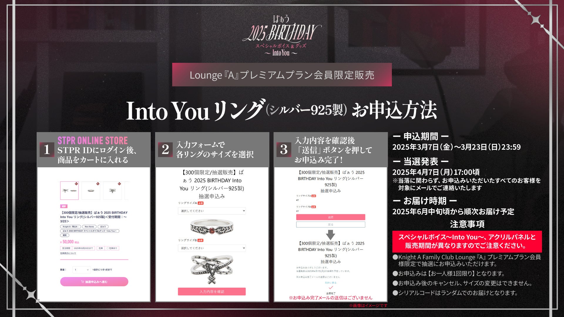 シルバーリングは、ファンクラブ プレミアムプラン会員限定かつシリアルコード付の数量限定グッズとなっています。スペシャルボイスには、ボイス購入者だけが楽しめるシークレットビジュアルとバースデー記念のキービジュアルの壁紙2種が、シルバーリングにはシルバーリングを手にした人だけが聴ける<スペシャルボイス〜Into You〜>の 「アナザーストーリー」を収録したボイスカードが特典としてついてきます。