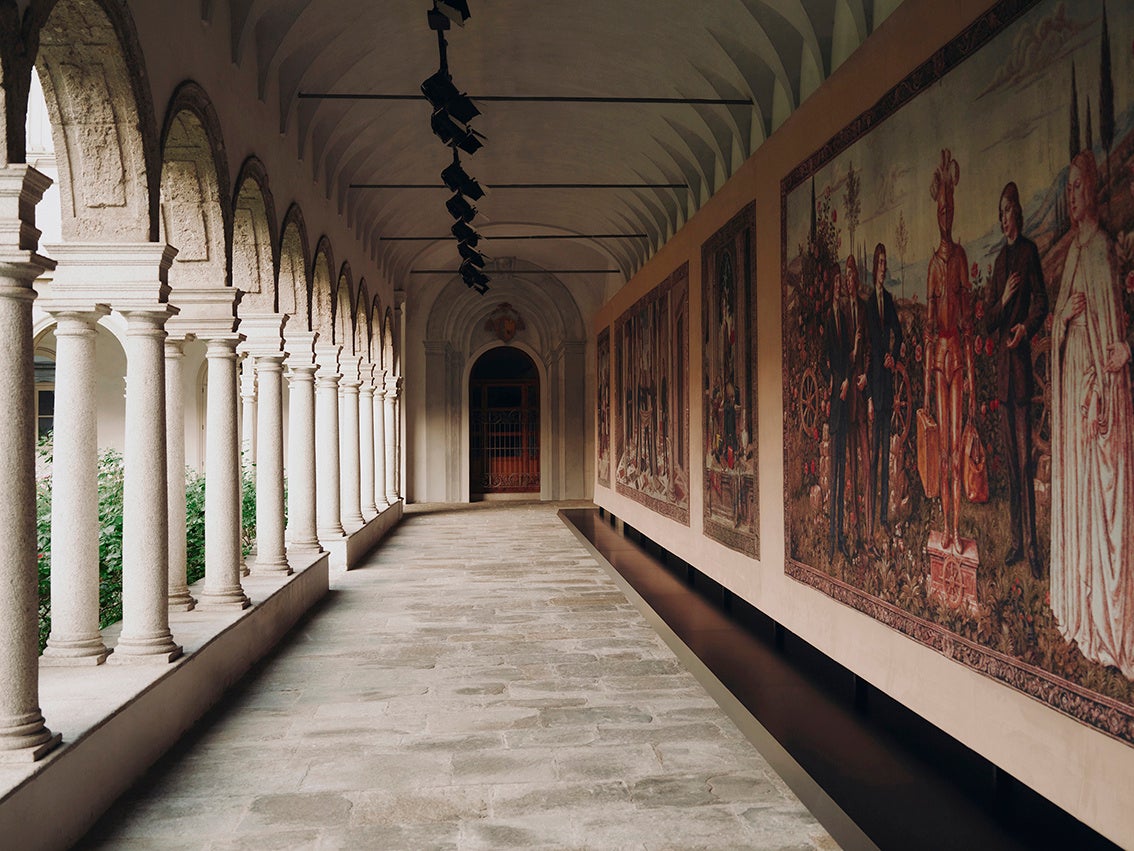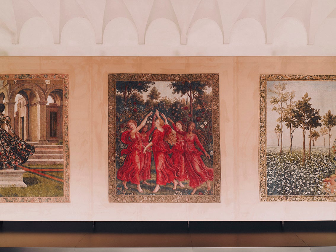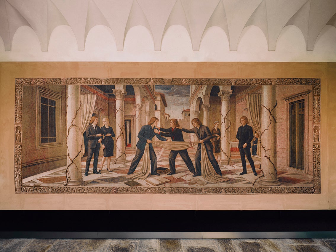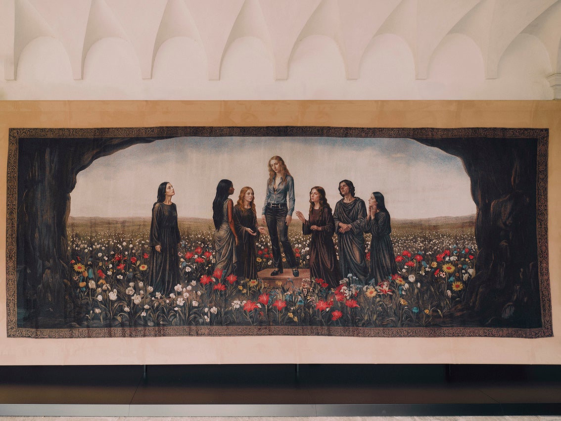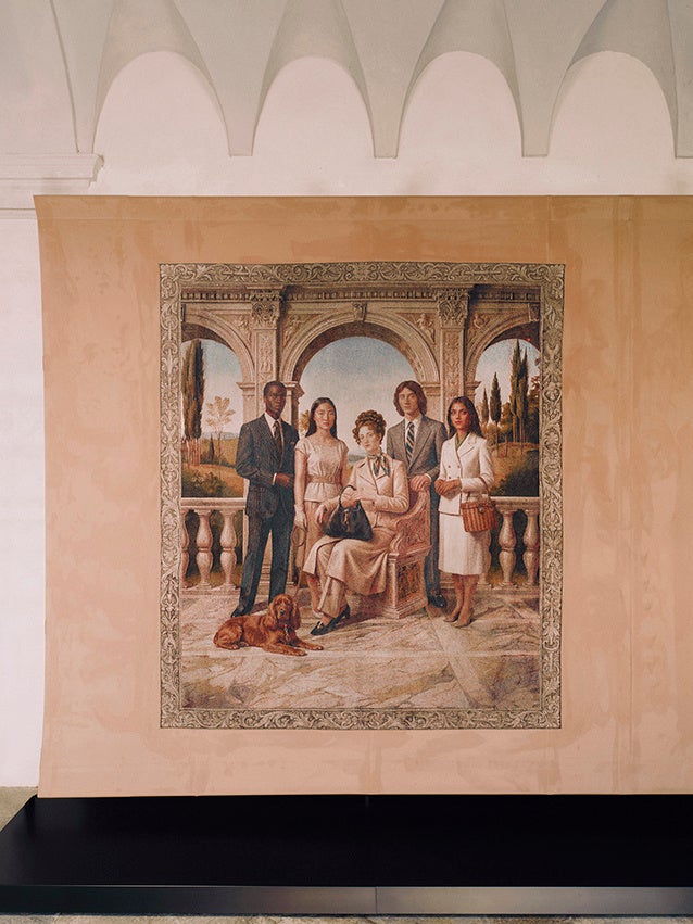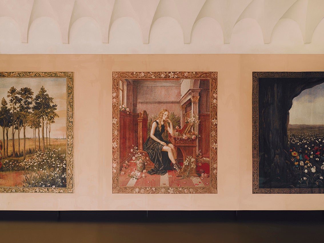 各タペストリーは、構図や色彩、空気感の変化によって、神話的な起源から現代的な再解釈へと移ろう流れを視覚化。人物やシンボル、風景が連なりながら変容することで、進化し続けるグッチの姿を映し出します。