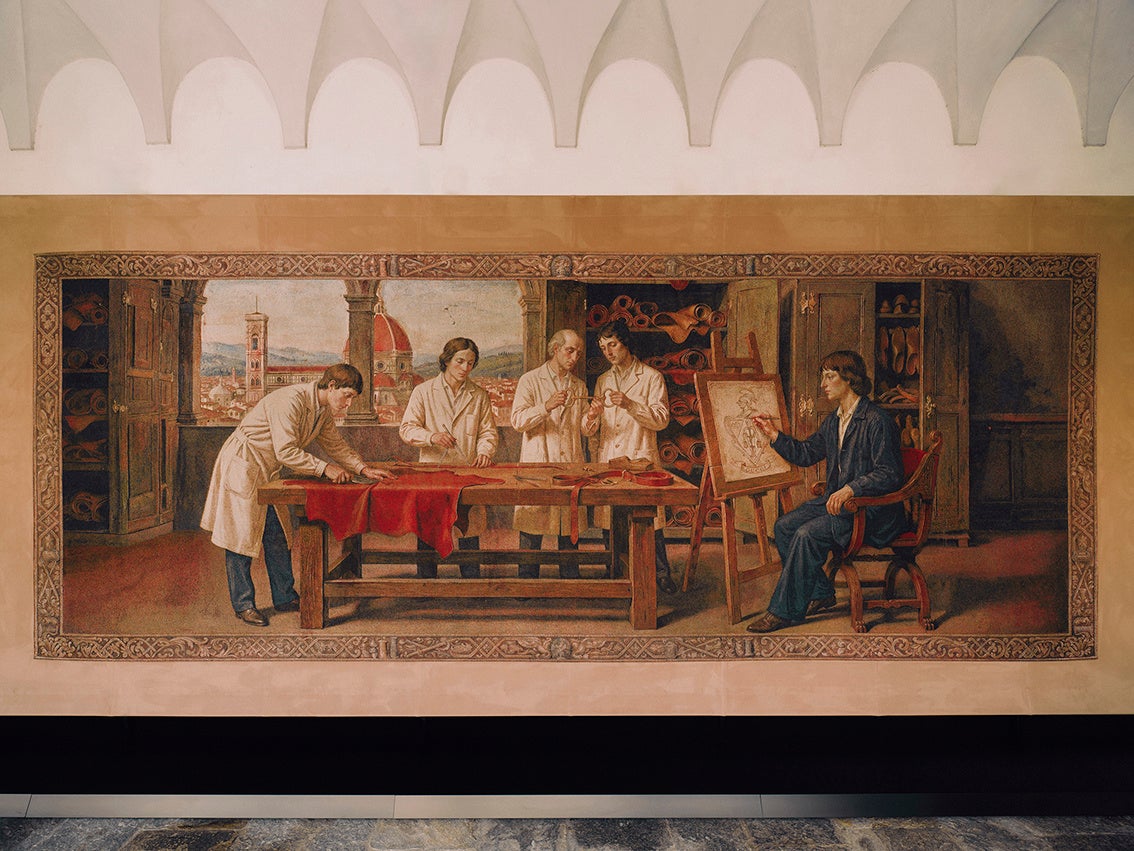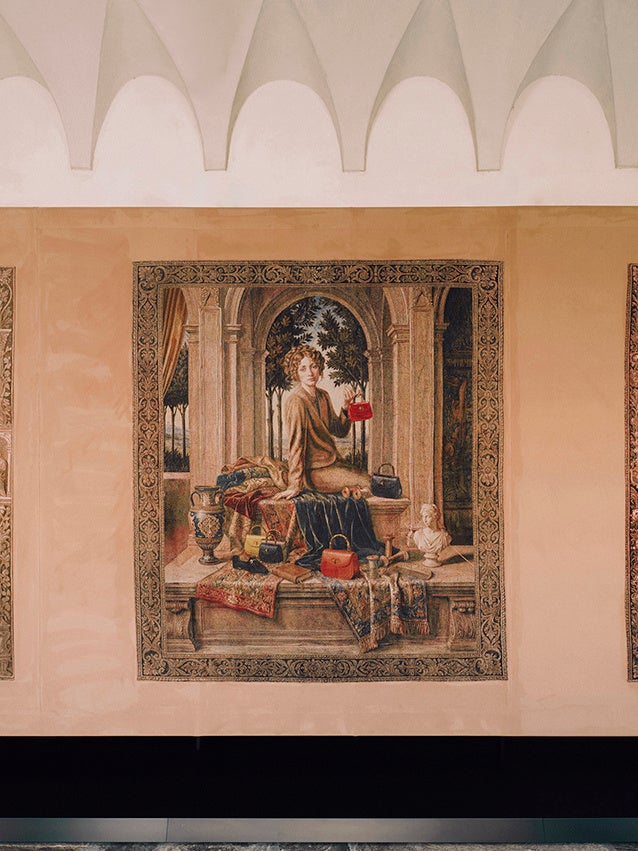 第2のシーンでは、インスピレーションが形となって現れます。ブランド創設の地フィレンツェのルンガルノ・グイッチャルディーニ通り11番地に構えた最初のグッチの工房で、職人たちが仕事に打ち込む姿が描かれています。道具やレザーに囲まれた空間で、トスカーナの都を背景にグッチのヴィジョンが具現化されていきます。1955年、「グッチ クレスト(Gucci crest)」の商標登録を機に、グッチの神話が形を成し始めます。このタペストリーには、その瞬間がアーティストのキャンバスに描かれたスケッチとして表現されています。