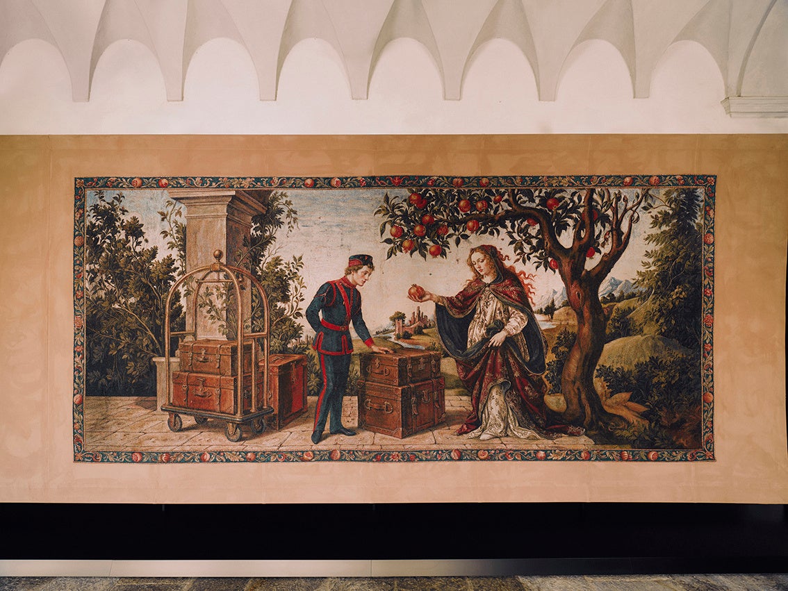 最初のタペストリーは、ブランド創設前の時代へと遡ります。ここには、若き日のグッチオ・グッチがポーターの制服に身を包み、ロンドンのホテル ザ・サヴォイで経験を重ねていた日々が描かれています。すべての始まりとされるこの都市での体験から、のちに世界的なラゲージブランドとして名をはせるグッチの最初のインスピレーションが生まれたのです。
