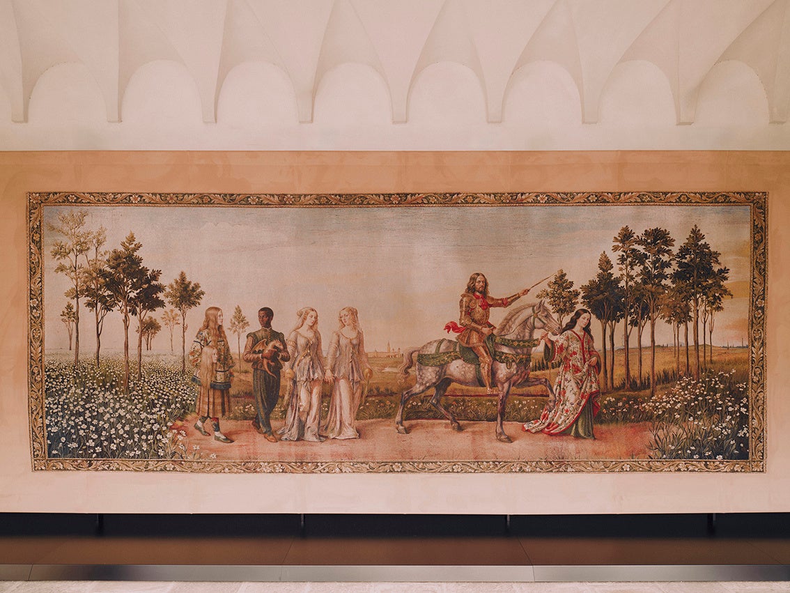 第3のタブローは、家族経営のレザーグッズおよびラゲージ ショップとして始まったグッチが、ジェットセッターやハリウッドスターに愛される国際的なブランドへと成長していく様子が描かれています。前のタペストリーに登場した「グッチ クレスト」は、黄金の鎧をまとった騎士へと姿を変え、両腕にラゲージを抱えています。トスカーナの丘陵と花々に彩られたこのタペストリーは、ブランドのルーツを想起させると同時に、その世界的な発展を描き出しています。