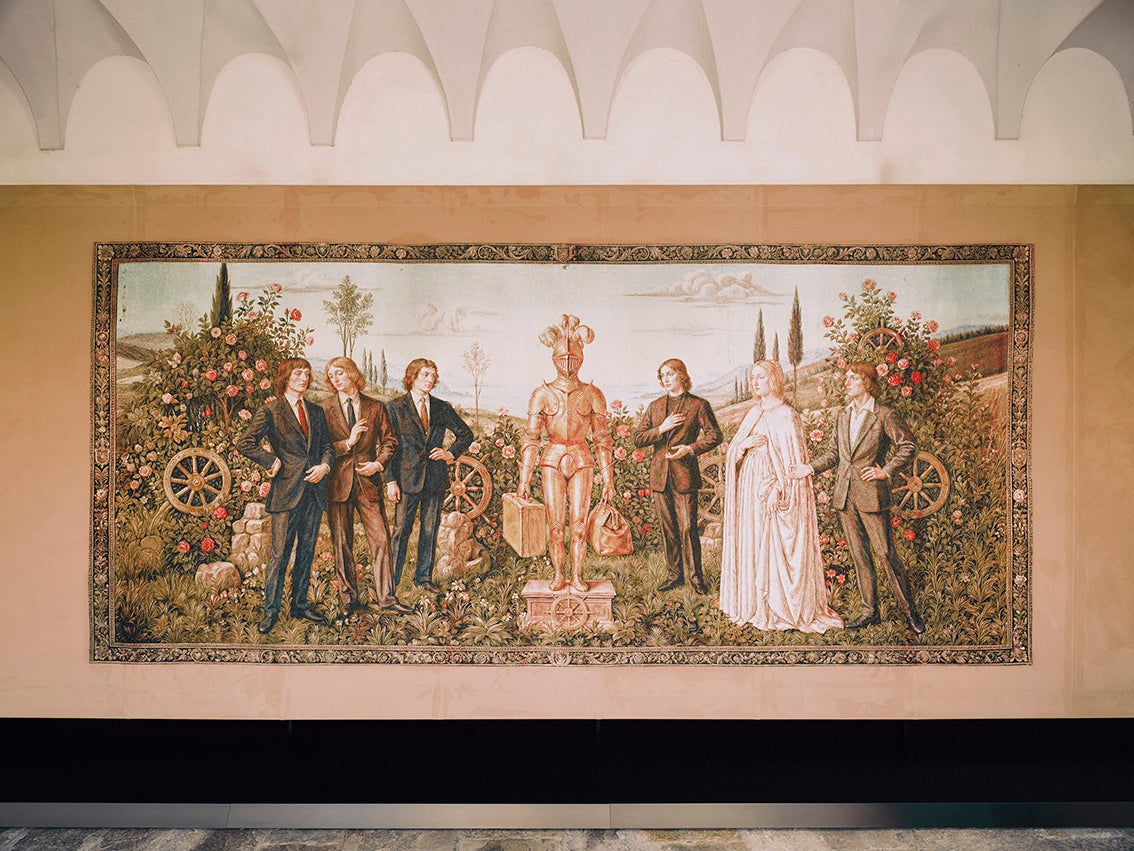 「Gucci Memoria」の中心を成すのは、ブランドの歩みを視覚的に表現した12点のタペストリーです。フィレンツェの伝統的な織物技術を背景に制作されたこれらの作品は、グッチの歴史における象徴的な瞬間を、緻密で重厚なタブローとして昇華させています。物語は、若き日のグッチオ・グッチがロンドンのホテル ザ・サヴォイで過ごしたブランドの原点となる日々から始まり、フィレンツェでの最初の工房の誕生、デザインコードの確立、そして国際的なラグジュアリーブランドへと発展する軌跡を辿ります。