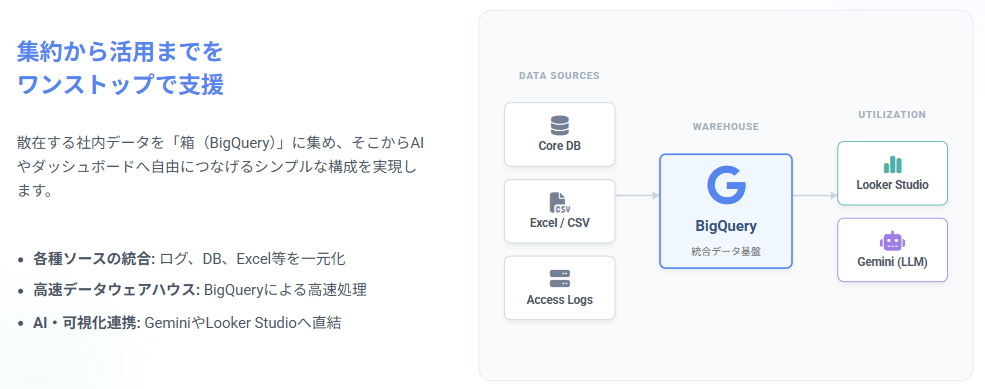 本サービスの核は、企業内のあらゆるデータ(売上・広告・顧客・オペレーション・コンテンツ等)をGoogle BigQueryに一元集約し、Looker Studioなどの可視化基盤を通じて、Geminiや他LLMへ“即時接続可能なAIデータ基盤”へ昇華させることです。