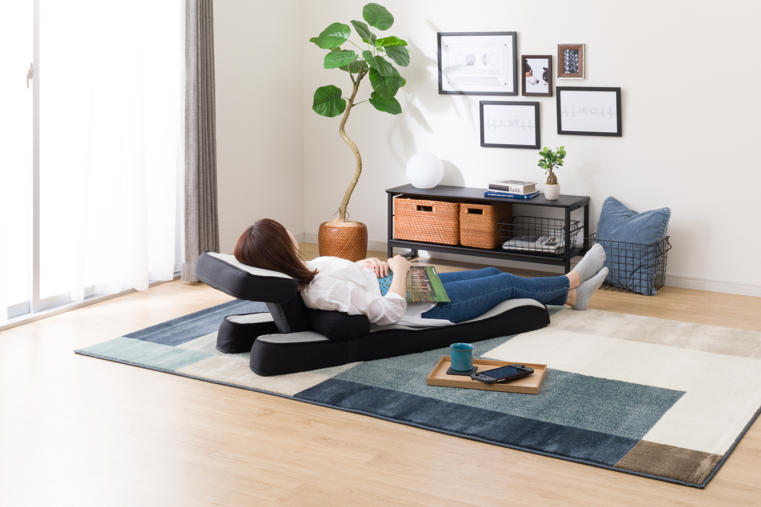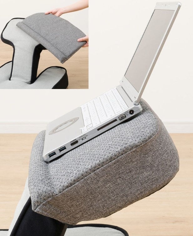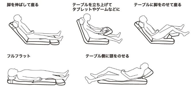 頭部までしっかり支えるハイバックの背もたれ。テーブル面は幅48cm・奥行28cmとノートパソコンも安定して置くことができます。背もたれとテーブル部分はそれぞれ14段階にリクライニング調整可能。ご利用シーンに合わせてお好みに調節いただけます。テーブル部分は頭をのせたり、フットレストとして使用したりと、様々な姿勢でのリラックスをサポート。付属のクッションは、お好みの位置を調整するためのベルト付き。姿勢や用途に合わせて、腰当て、ヘッドレスト、枕、膝元に置いて肘置き用クッションとしてなど、自由にご利用いただけます。