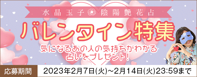 テレビ番組「ゴゴスマ」「ダウンタウンDX」出演で話題の占い師「水晶玉子」が月額公式サイトで、『バレンタイン特集』を公開いたしました。今なら、気になるあの人の気持ちがわかる占いをプレゼント中です。この機会をお見逃しなく!
