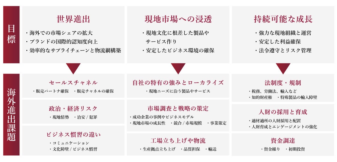 海外事業戦略から海外現地法人の立ち上げ、国別の拡販戦略、現地人材の採用や育成方法まで、海外事業で高収益を生み出してきたプロフェッショナル人材が、海外進出や海外現地法人経営、高収益組織づくりなどの課題解決に向けたアドバイスを提供します。