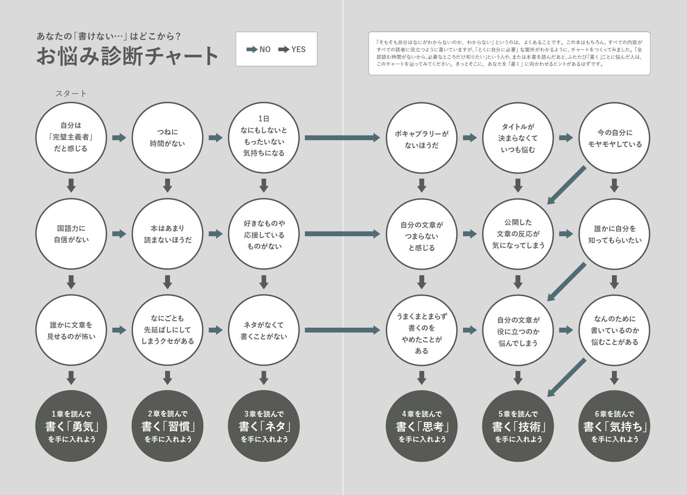 「そもそも自分は何がわからないのか、わからない」というのは、よくあることです。この本はもちろん、すべての内容を、すべての人の役に立つようにまとめていますが、「とくに自分に必要」な箇所がわかるように、診断チャートが作成してあります。「全部読む時間がないから、とりあえずいま必要なところだけ知りたい」という人や、または本書を読んだあと、また「書く」ことに悩んだ人は、このチャートをたどってみてください。きっとそこに、あなたを「書く」に向かわせるヒントがあるはずです。