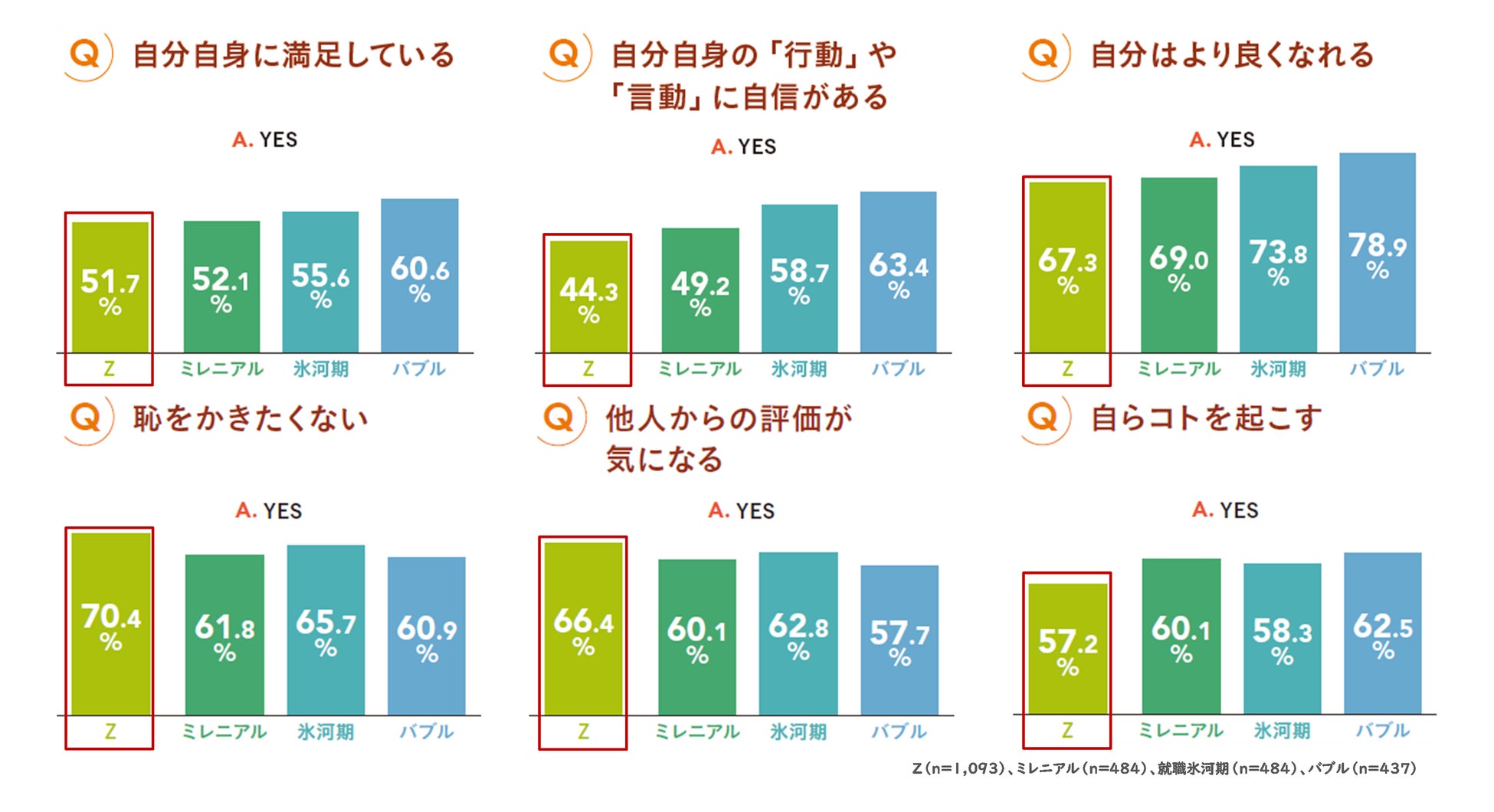 自分の行動や言動に自信が持てず、前向きな1歩を踏み出しきれない(世代別で最も低い結果)