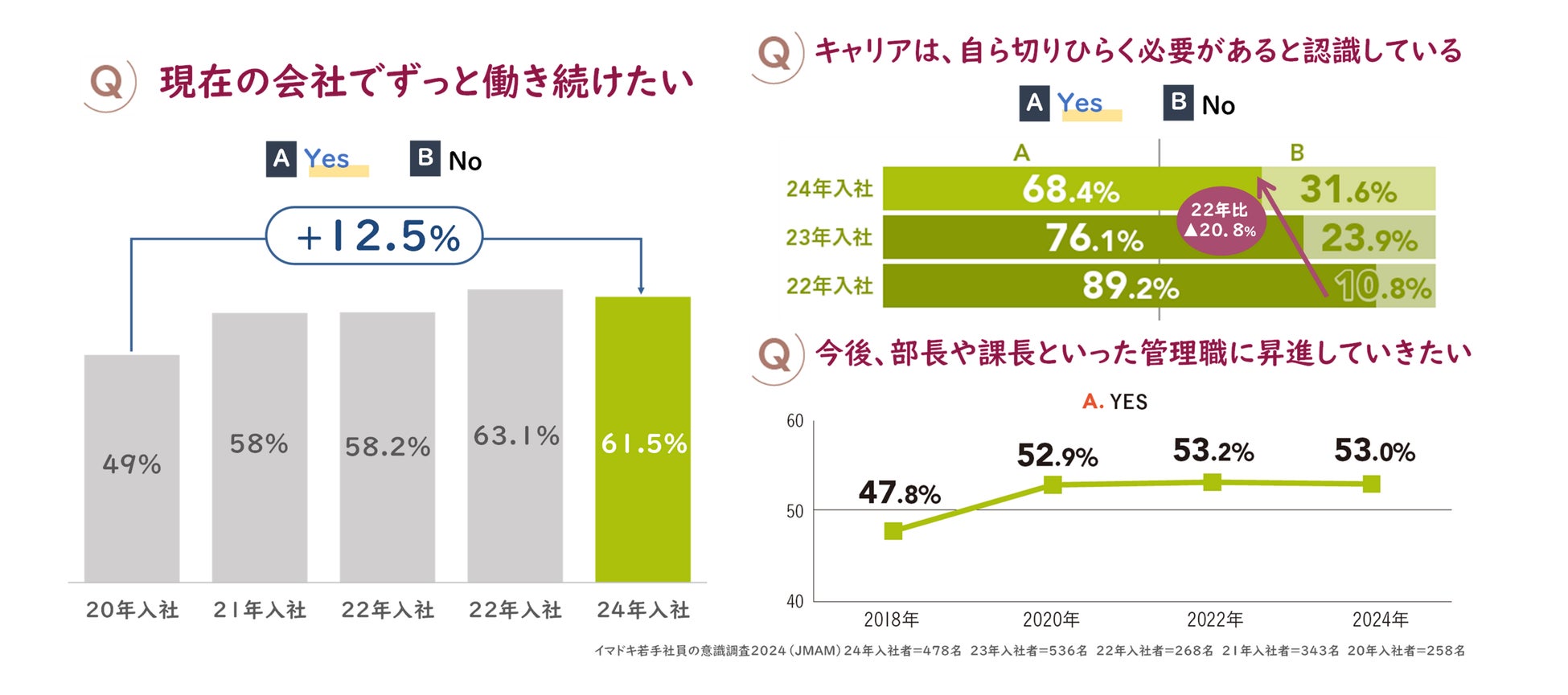 株式会社日本能率協会マネジメントセンター(代表取締役社長:張 士洛、東京都中央区、以下JMAM[ジェイマム])は、新入社員の意識や行動、指導者の指導や育成に関する調査報告書「イマドキ新入社員の仕事に対する意識調査2024」を公開しました。本調査は2023年から2024年に入社した新入社員と、新入社員の育成に関わる上司・先輩社員の計2,498名を対象に2024年6月に実施しました。経年比較を踏まえ、調査結果からZ世代の「働き方」に関する価値観や期待を抜粋して紹介します。