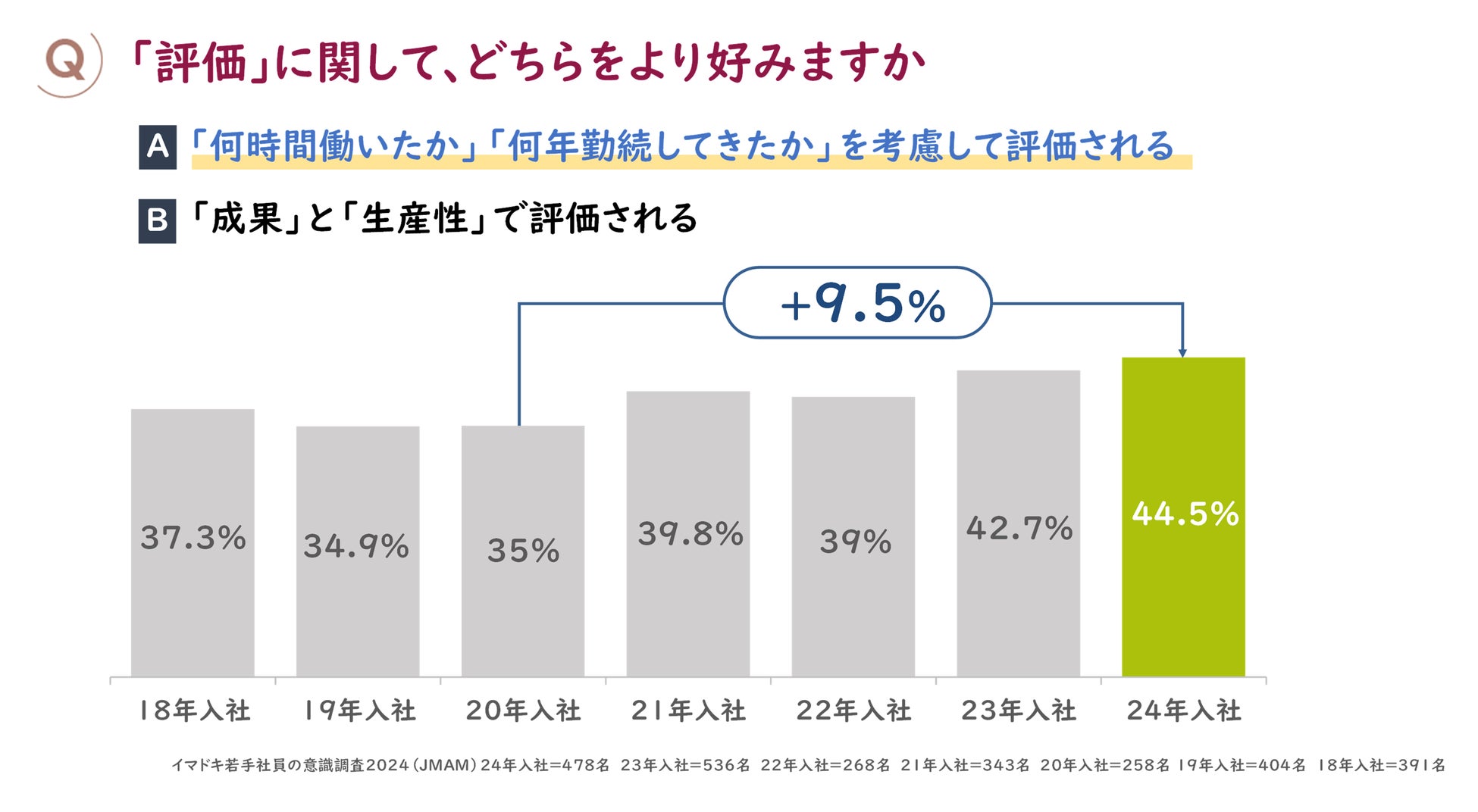 評価は、成果や生産性よりも「何時間働いたか、何年勤続してきたか」が上昇(44.5%、18年比:+7.2%)