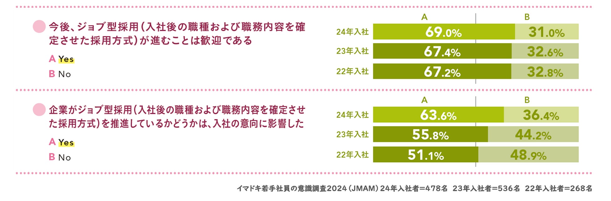 ジョブ型志向が高く22年以降増加傾向(歓迎する:全体の69.0%、入社意向に影響する:全体の63.9%