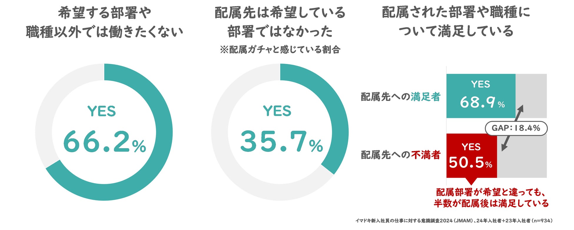 ・入社時に「配属ガチャ」と感じるのは35%程度だが、配属後の満足度は上昇傾向