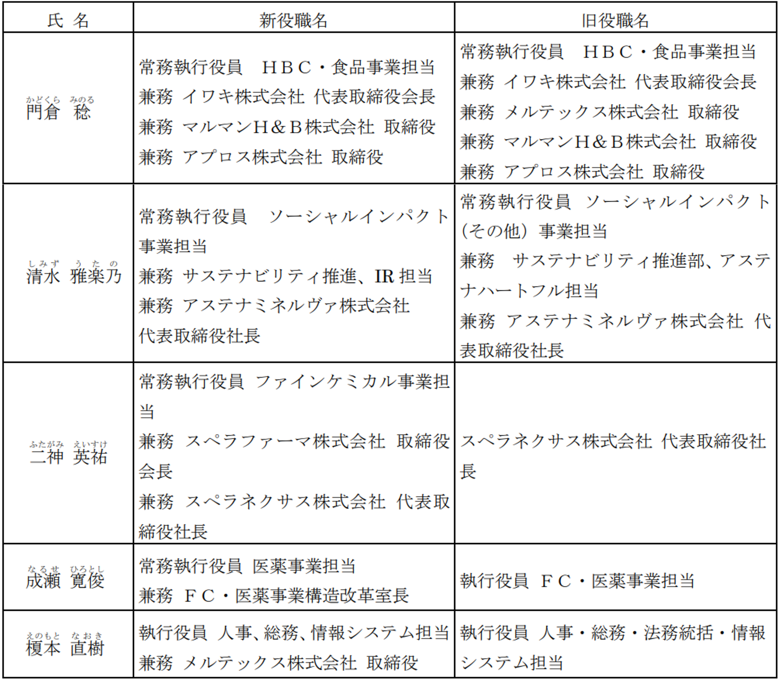 アステナホールディングス株式会社(本社:東京都中央区、代表取締役社長:瀬戸口 智、証券コード:8095)は、2025年2月27日開催の取締役会において、下記のとおり取締役の委嘱業務の変更、組織変更及び人事異動について決議いたしましたので、お知らせいたします。
