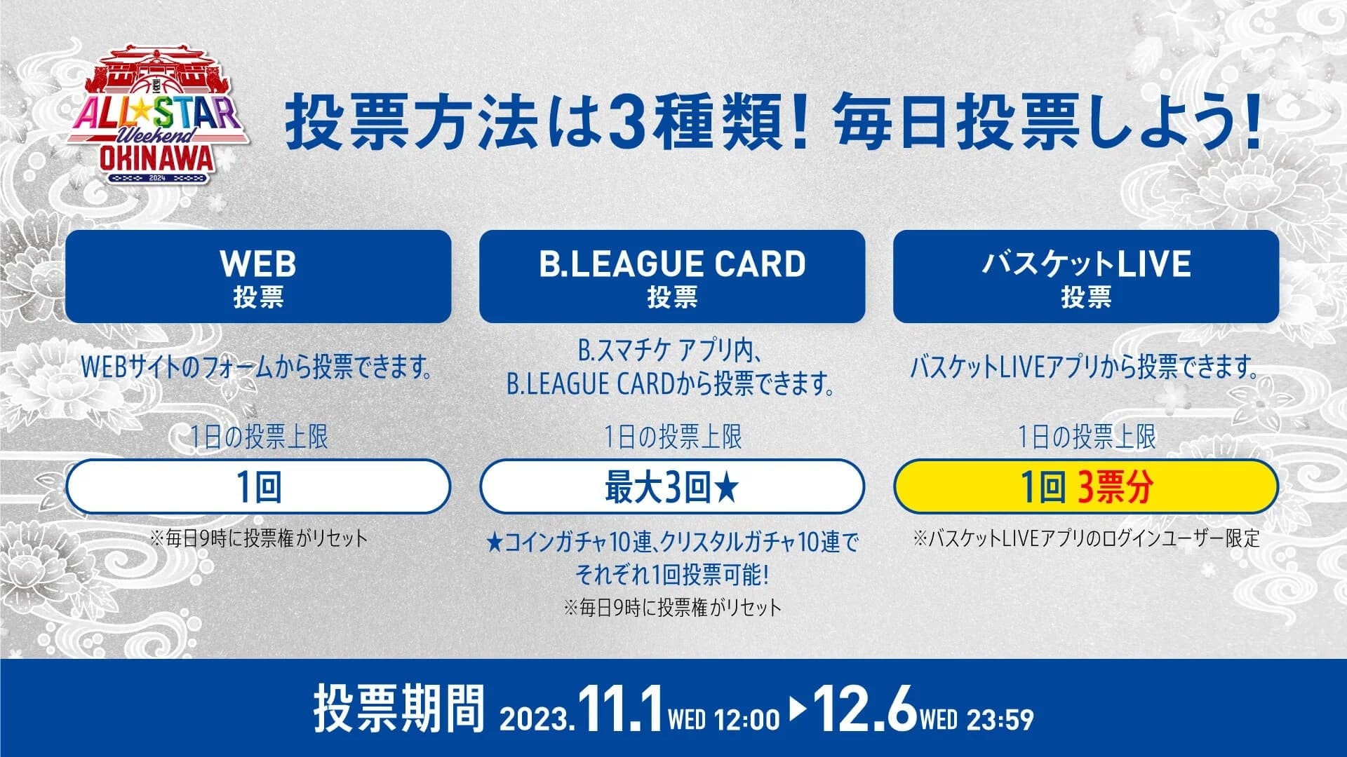 オールスターに多くの選手が参加できるよう、①B.LEAGUE公式WEB、②B.LEAGUE CARD、③バスケットLIVE、3つの投票方法で、シーホース三河選手へ投票よろしくお願いします!