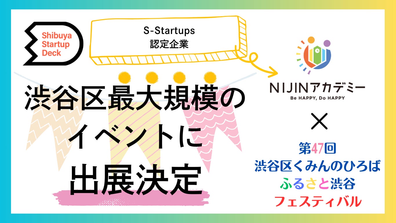 株式会社NIJIN(本社:東京都江東区、代表取締役:星野達郎)が運営する不登校オルタナティブスクール『NIJINアカデミー』は、11月2日(土)3(日)に開催される「第47回渋谷区くみんの広場ふるさと渋谷フェスティバル」で渋谷区と民間企業の産官連携でスタートアップをサポートするコンソーシアム“Shibuya Startup Deck”によるスタートアップ認定制度「S-Startups」認定企業として、渋谷区政PRコーナーのスタートアップ支援事業テントに学校PRブースを出展することをお知らせいたします。