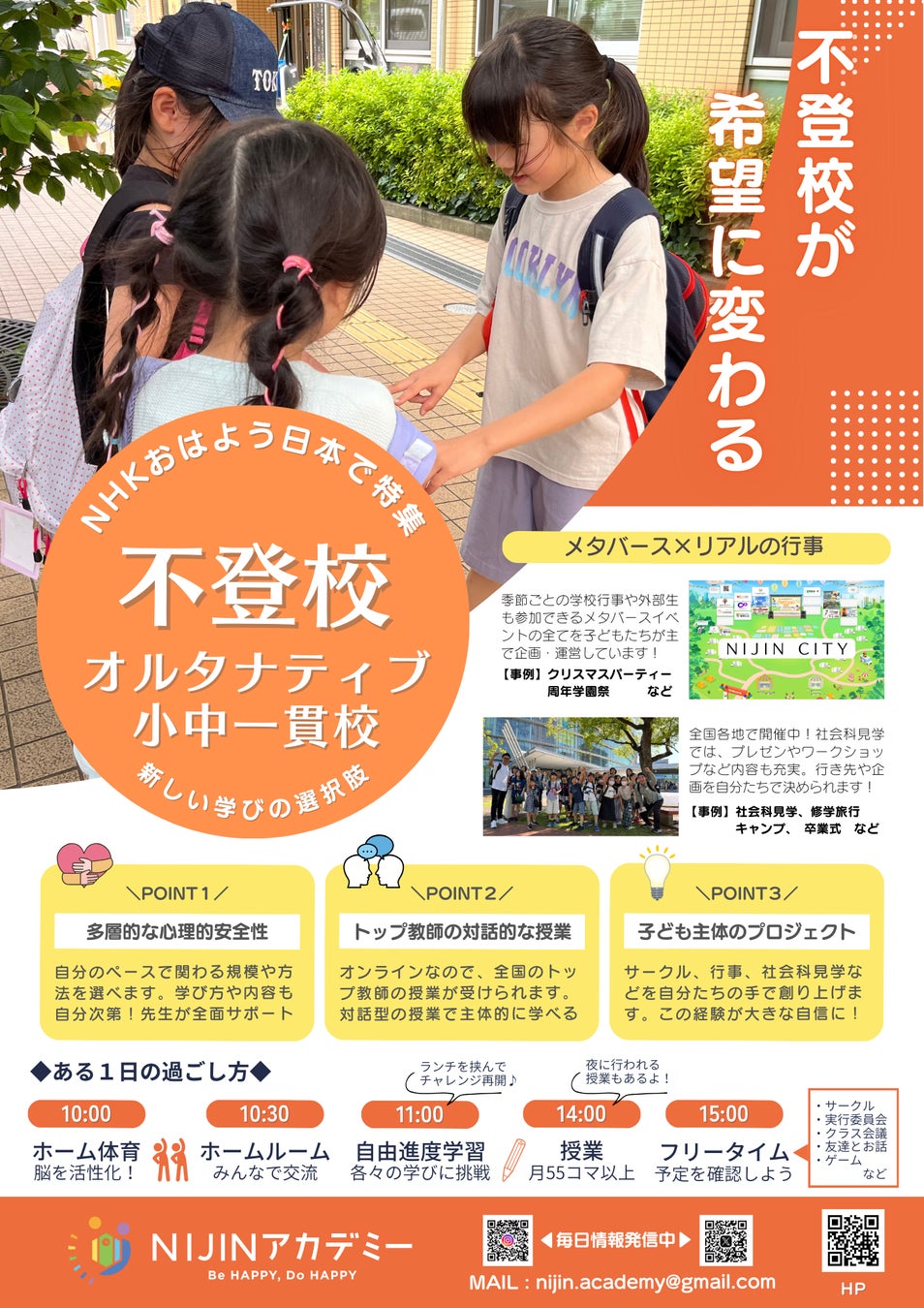 本イベントでは、不登校オルタナティブスクール「NIJINアカデミー」のメタバース校舎を実際に体験できるほか、プロ講師陣による授業の動画や、これまでNIJINアカデミーで行われてきた大企業とコラボをした社会科見学などの様子もご覧いただけます。