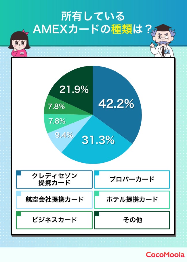 所有しているAMEXカードの種類は「クレディセゾン提携カード」が最多で約42%。次いで「プロパーカード」が約31%を占める。