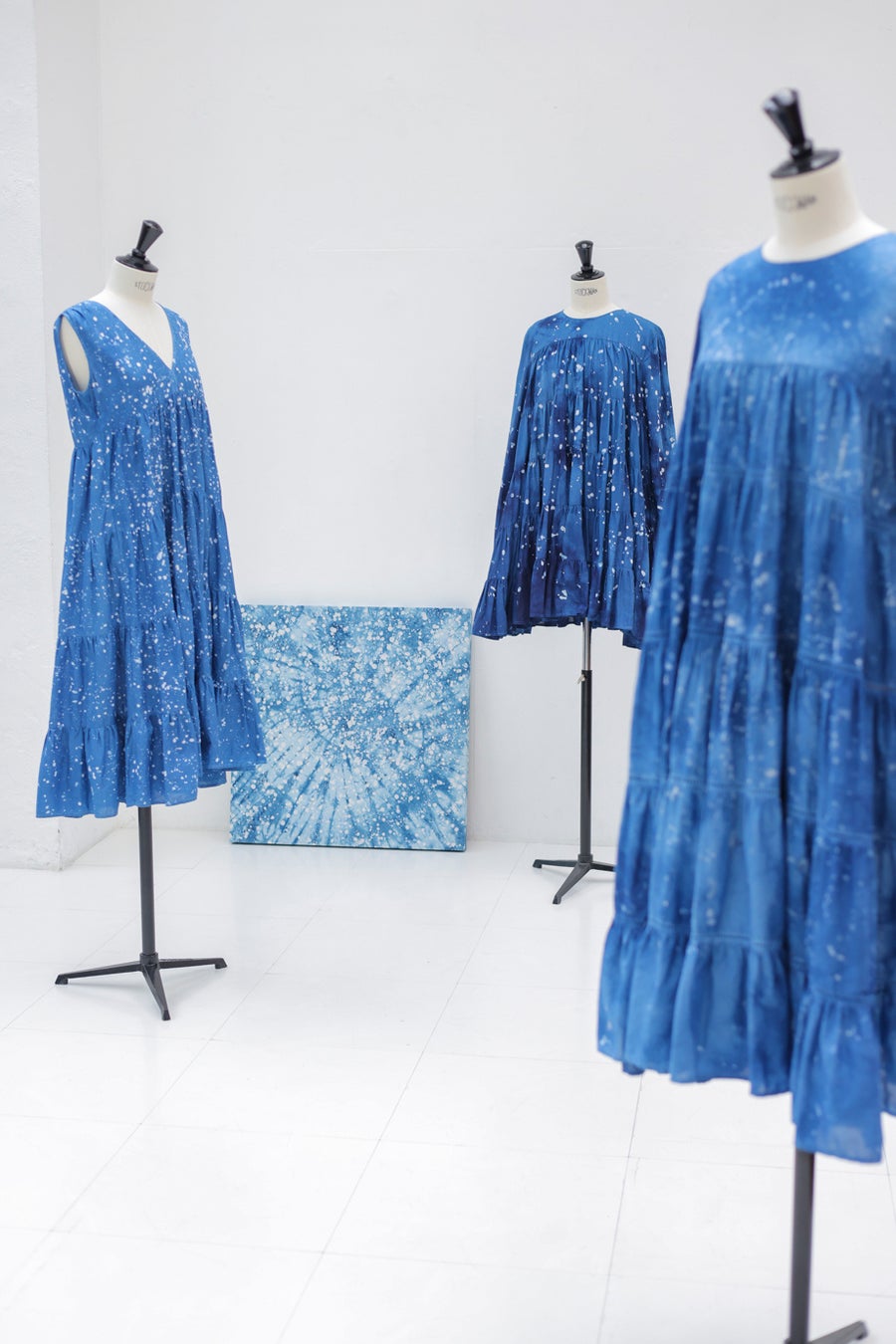 今回のコラボ作品は蜜蝋を溶かして、染まらないように蜜蝋で絵を描いてから染め重ねて、乾いたらまた蜜蝋で描き、染めたり、絞り染めを繰り返して出来上がりました。「藍は生き物」まさにそれを体感できるスペシャルピースばかりでひとつひとつ風合いも様々。宇宙空間のようなスプラッシュデザインは生地から染めまで天然100%のアートとなり、眺めているだけでインスピレーションを与えてくれます。微生物にゆだねること、発酵のコンディションを見ながら染め上げることは日々藍と向き合っている松﨑氏ならではのなせる技です。