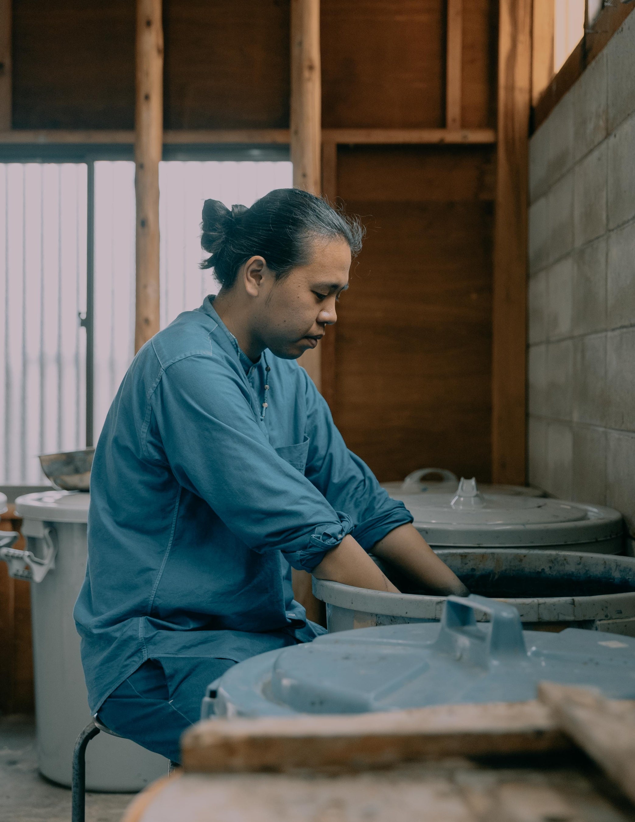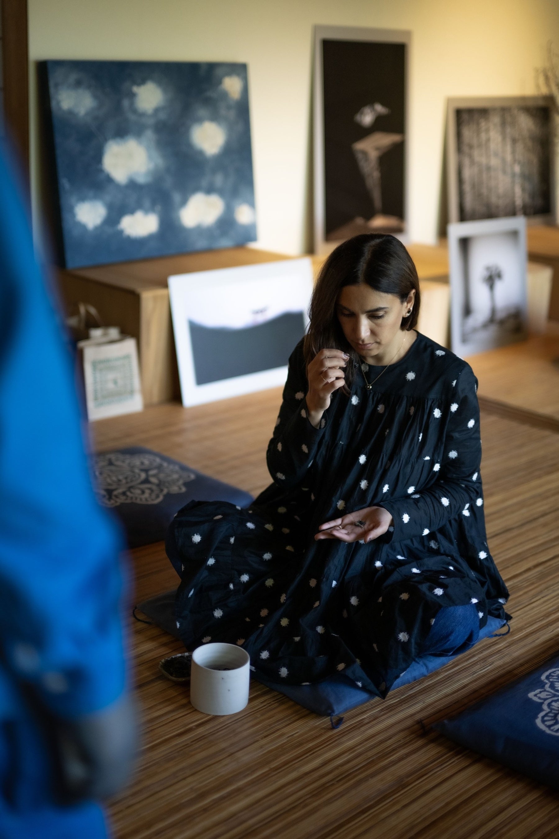 春風が心地よく巡る2025年5月、デザイナーのMarinaと京都の工房を訪れました。「京都の島原の外は染まるほど藍畑だらけだった」と書かれた松尾芭蕉の弟子(服部嵐雪)1700年の俳句や、「京洛外の藍は日本の藍の中で最も高品質」と記された1712年出版の日本の百科事典など、たくさんの貴重な書物とともに京藍について学び、松﨑氏の深い知識にMarinaも興味津々で真剣に聞き入っていました。