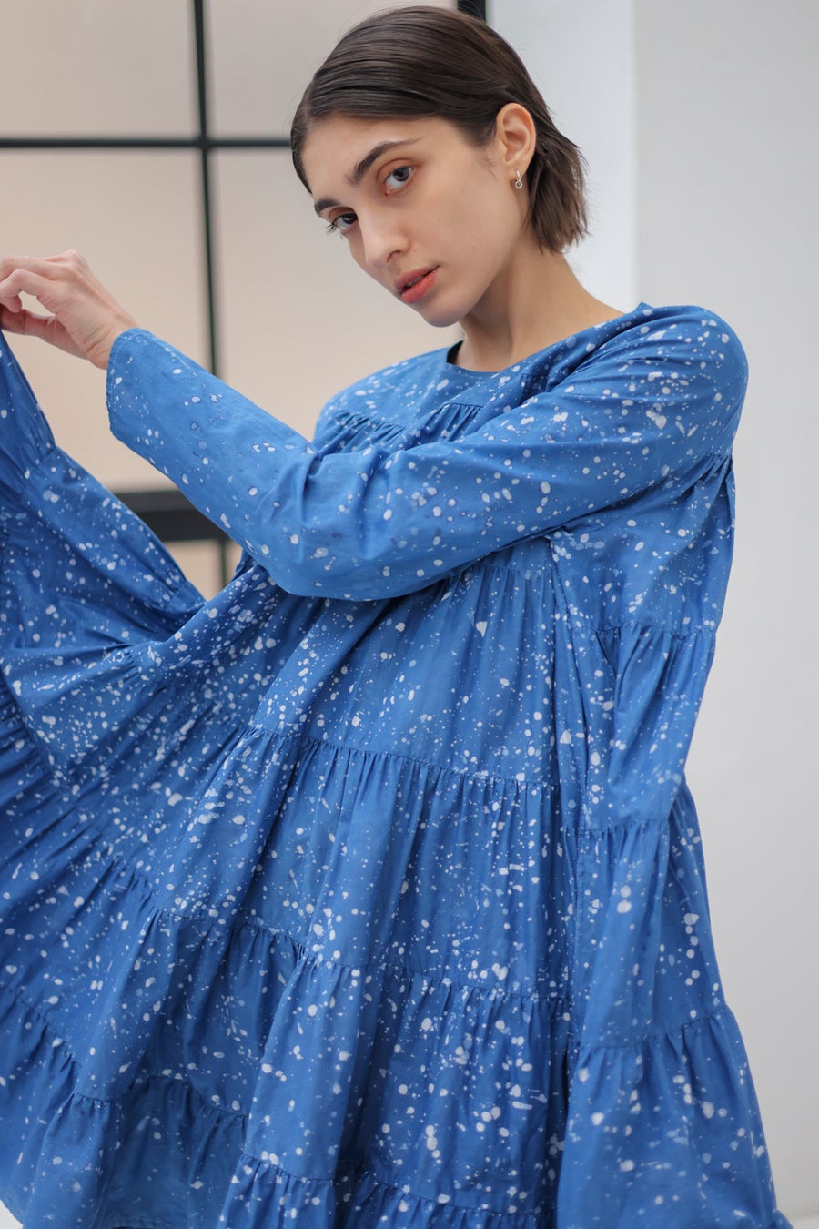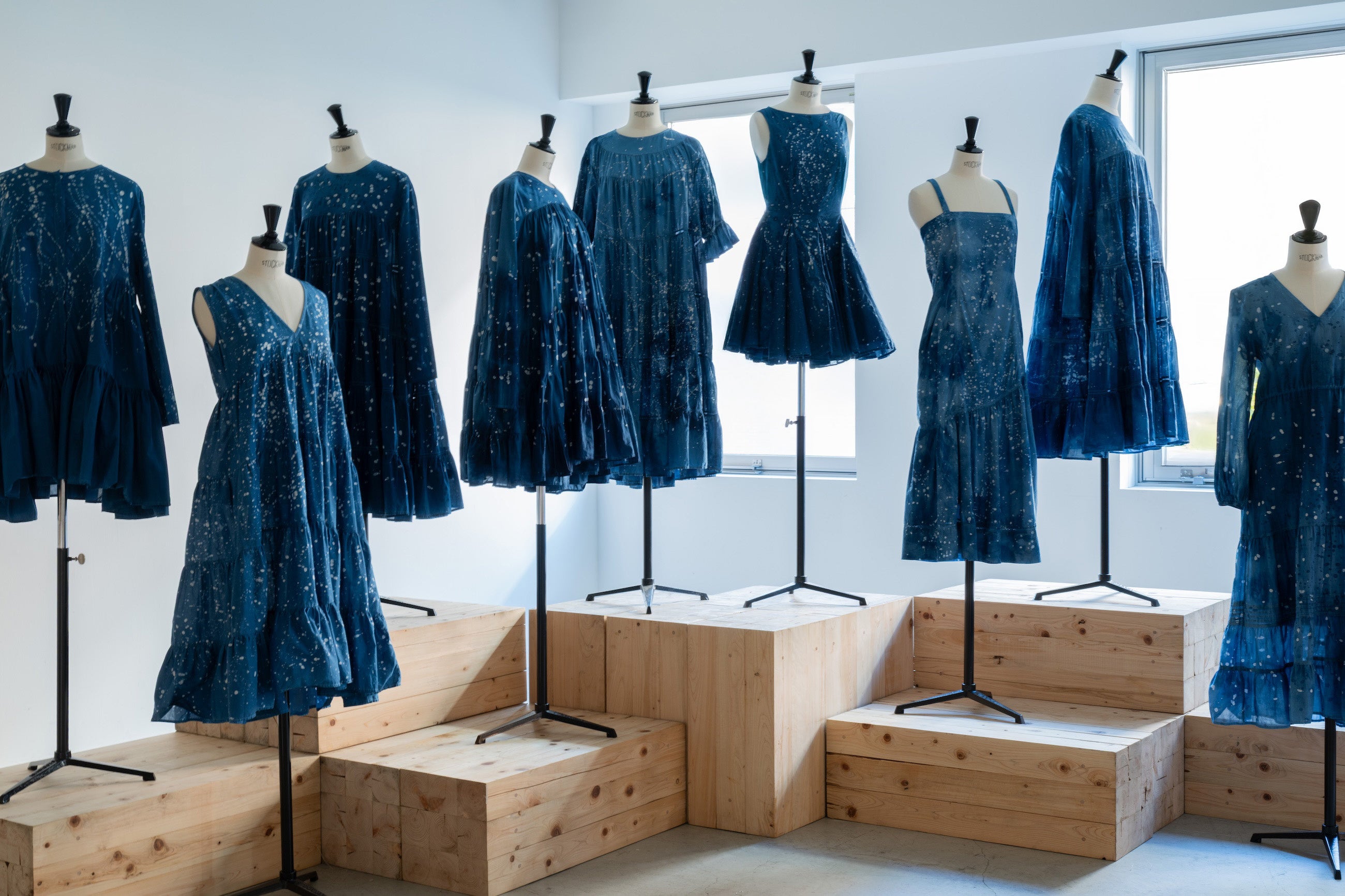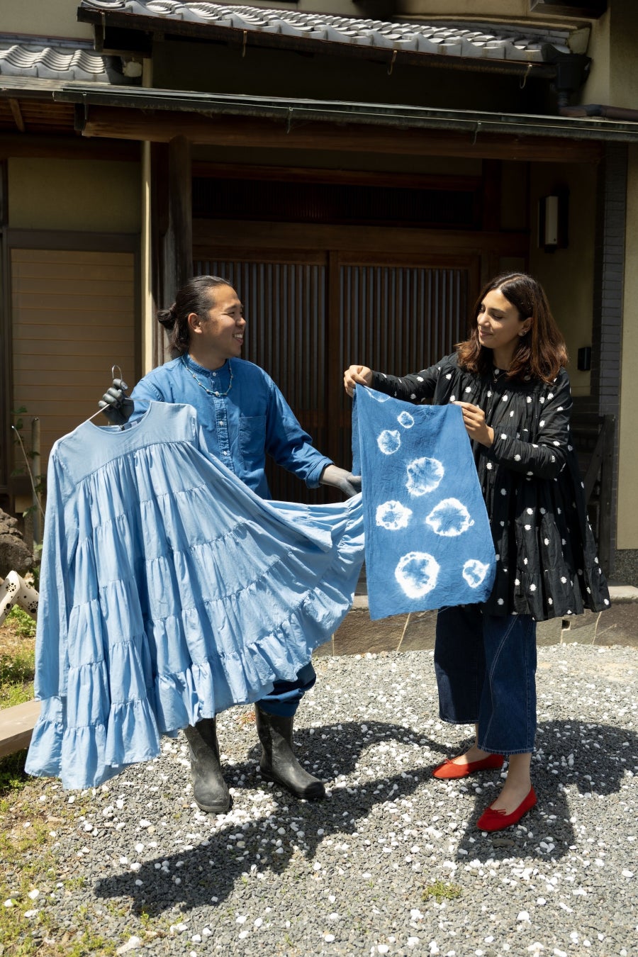 ニューヨークで“ジャパンブルー”に出会い、100年前(大正時代)に滅びてしまった京藍を復活させ、藍染のはじまりの地である地元京都・洛西で日本古来の植物で藍染をしているアーティストの松﨑陸氏。OEKO-TEX🄬認証されたコットンやリネンなどの天然素材を毎シーズン使い続け生地ロスを減らすなど、サステナブルな生産背景を持つニューヨークブランド・マーレットのMarina。