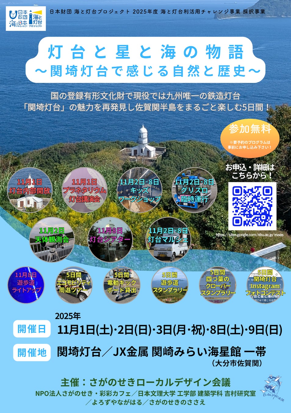 さがのせきローカルデザイン会議(構成団体:NPO法人さがのせき・彩彩カフェ、日本文理大学 工学部 建築学科 吉村研究室、よろずやながはる、さがのせきのささえ)は、2025年11月1日(土)・2日(日)・3日(月祝)・8日(土)・9日(日)の5日間、イベント「灯台と星と海の物語~関埼灯台で感じる自然と歴史~」を開催します。大学生や市民有志が地域活性化活動の一環として、国の登録有形文化財で現役では九州唯一の鉄造灯台「関埼灯台」の魅力を再発見し、佐賀関半島をまるごと楽しんでいただこうと、全14種類のバラエティに富んだプログラムを企画しました。