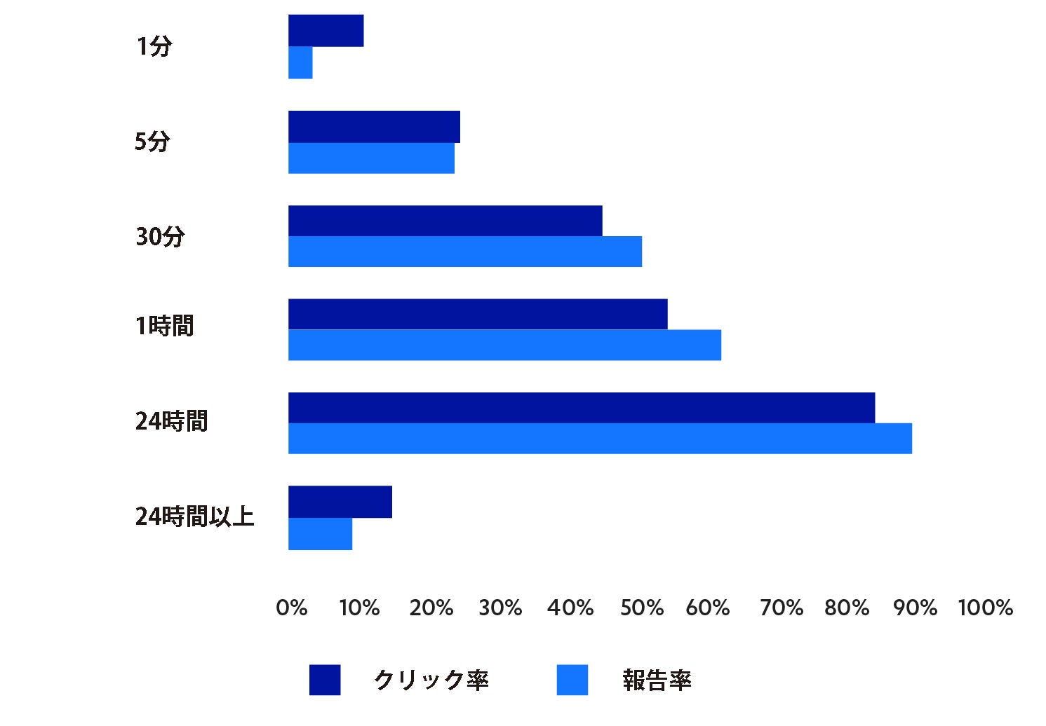 本レポートでは、迅速かつシンプルな不審メール報告プロセスの価値も強調されていました。フィッシング演習メールが受信ボックスに届いてから最初の1分間で、「不審である」と報告した社員の実に3倍以上もの社員がメール中のリンクをクリックしていました。この数字は、5分前後で横ばいとなり、その後も同じ傾向が続いています。
