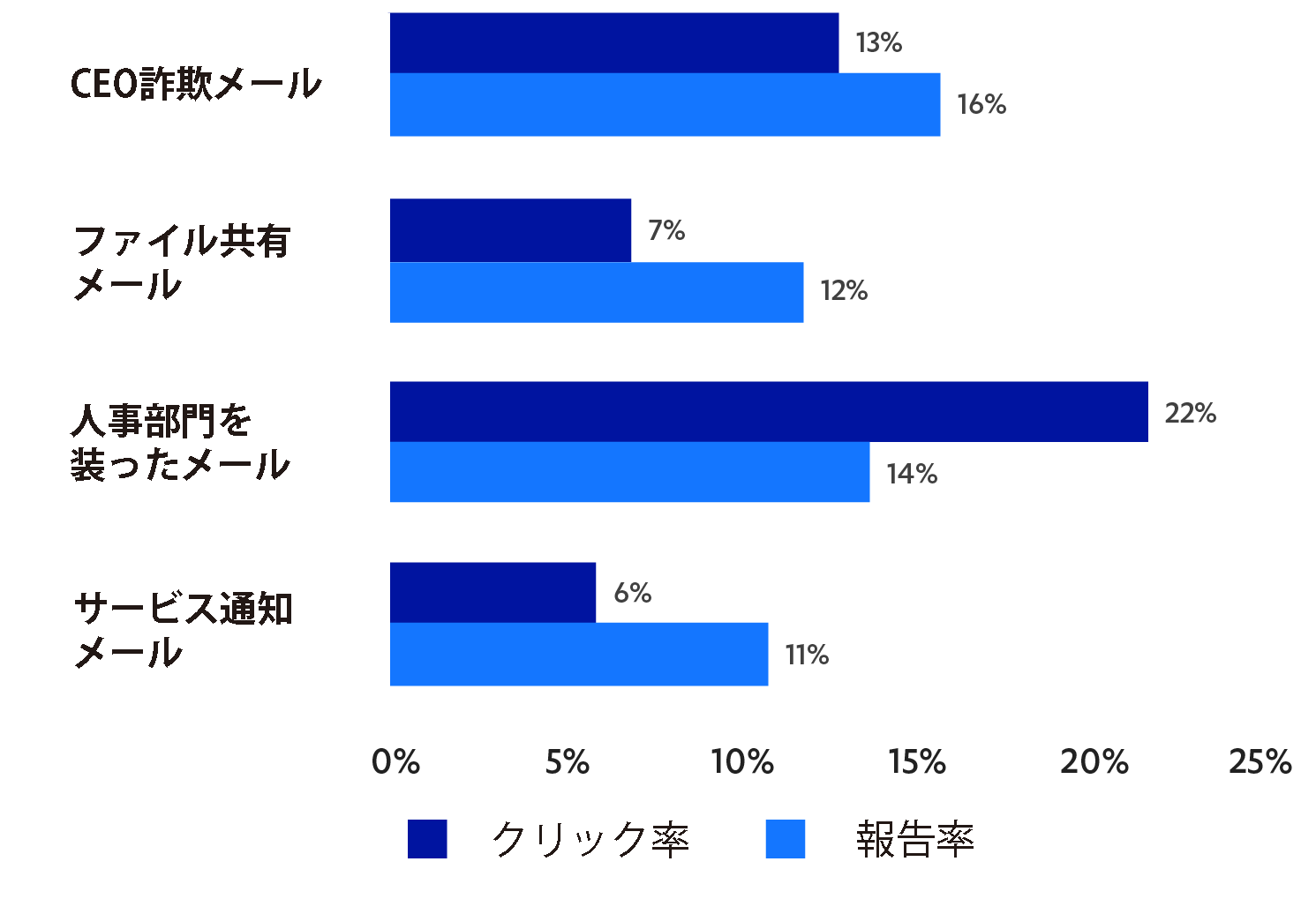 今回の調査で最も高い割合でクリックされたのは休暇取得に関する人事部門からの通知を模したメールであり、メール受信者のうち22%がメール中のリンクをクリックしていました。2番目に多くクリックされていたのは、メール受信者に請求書の作成を依頼するメール (本レポートでは「CEO Fraud: CEO詐欺」と呼んでいます) で、受信者のうち16%がクリックしていました。続いてドキュメント共有を模したメール (7%)、オンラインサービスからのサービス通知を装ったメール (6%) となっていました。