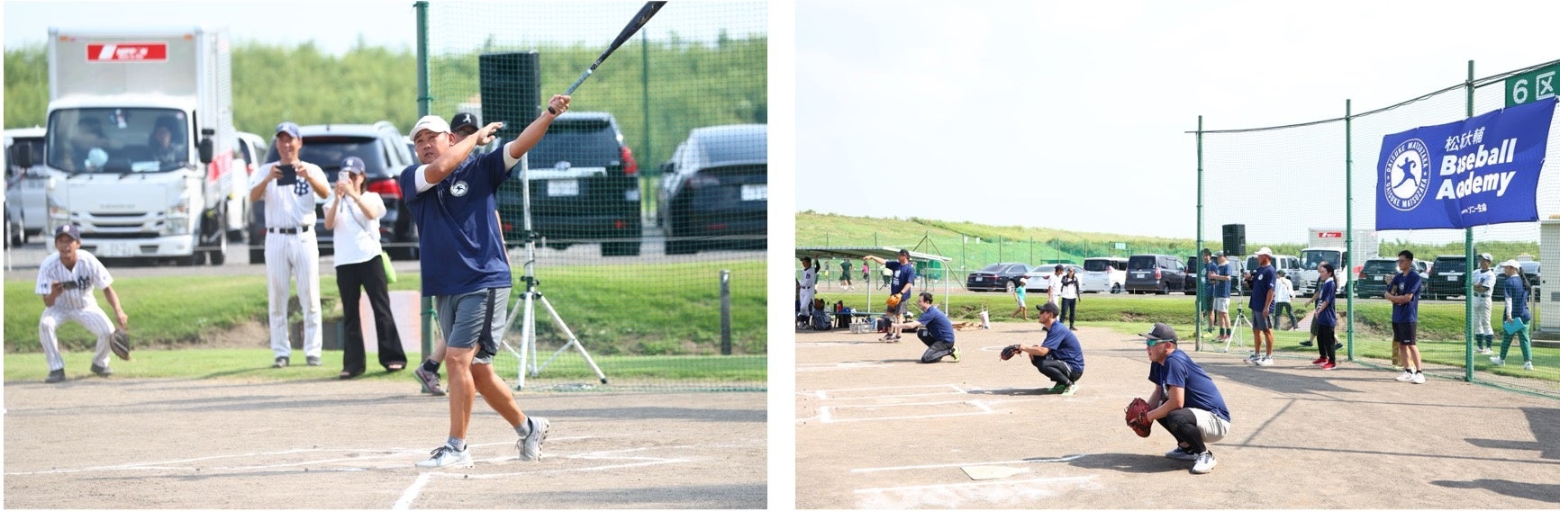 また、バッティング指導では、バッターボックスに立ち、特大“場外弾”を連発。子ども達からは「凄すぎる!カッコいい!」大きな歓声が上がりました。また、甲子園で5本のホームランを打った元東京ヤクルトスワローズの鵜久森もバッティングを実施。松坂さんも「打球の勢いが違いますね!」と絶賛し、圧巻のバッティングを披露しました。