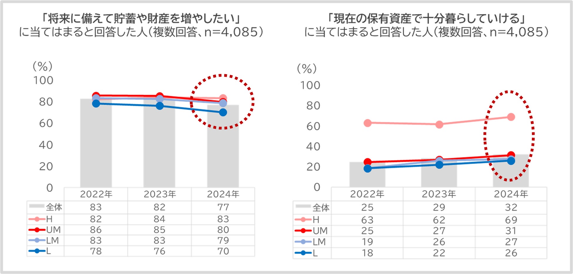 また、「現在の保有資産で十分暮らしていける」と回答した人は、ハイエンド層(H)が69%で最も多く、ローワー層(L)26%、ローワーミドル層(LM)27%、アッパーミドル(UM)31%と比較すると2倍ほど多い結果となりました。