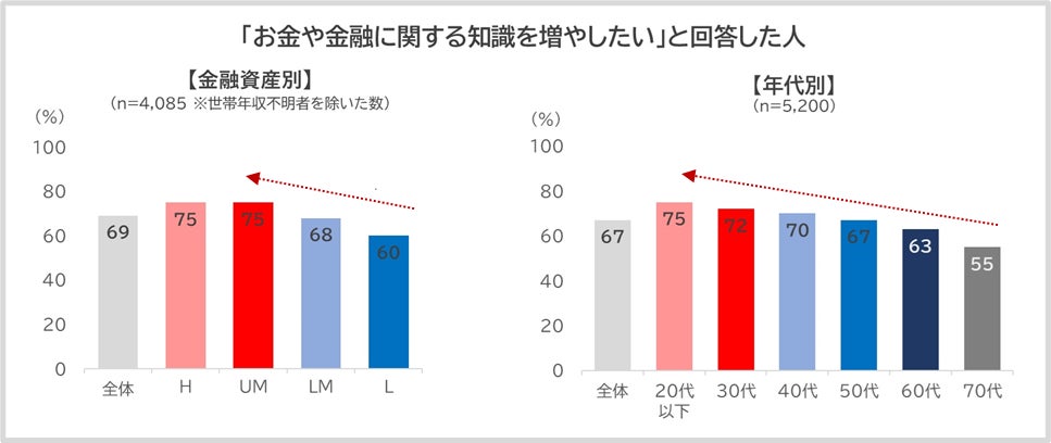 また、「お金や金融に関する知識を増やしたい」に関して、金融資産別、年代別に見たところ、学習意欲は、金融資産の多い層、また若年層ほど高い傾向となりました。
